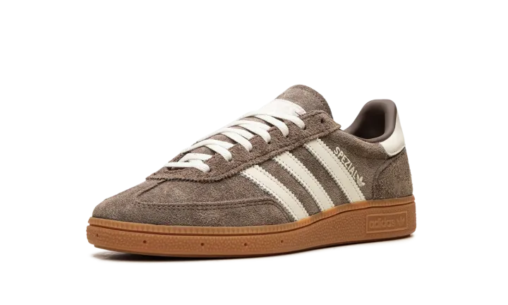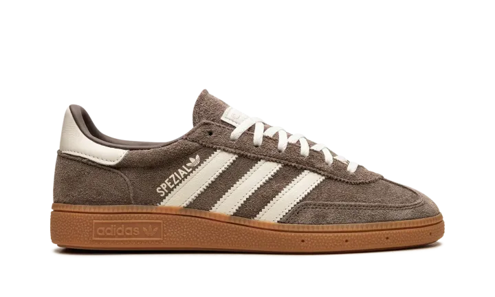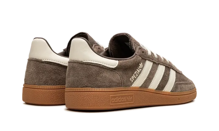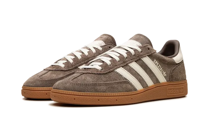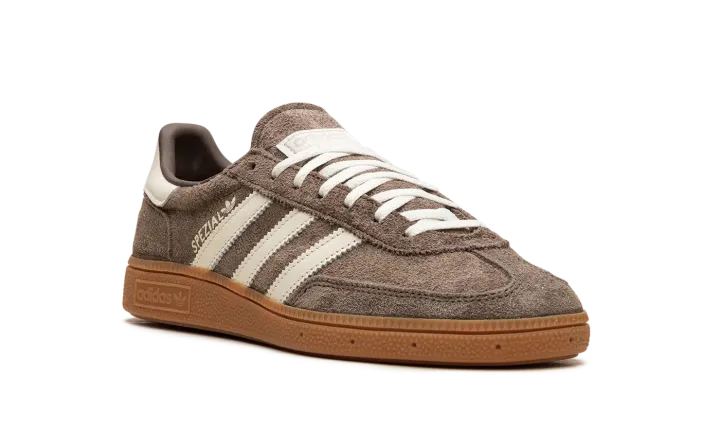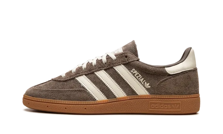 The Women's adidas Handball Spezial "Earth Strada/Gum" is a women's-exclusive colorway of the lifestyle shoe with an earth tone color scheme. The upper is complete with an Earth Strada, or brown, suede construction and contrasted with Cream leather Three Stripes branding on the sides. Cream "Spezial" and adidas Trefoil logos appear on the lateral side of the mid-panel, while more cream leather can be found on the heel tab. Underfoot, a gum sole completes the look. Release date: November 10, 2023