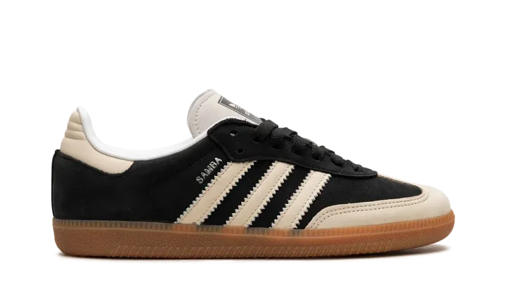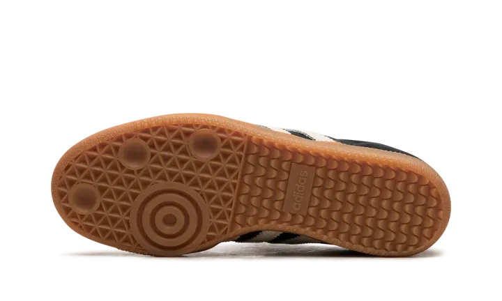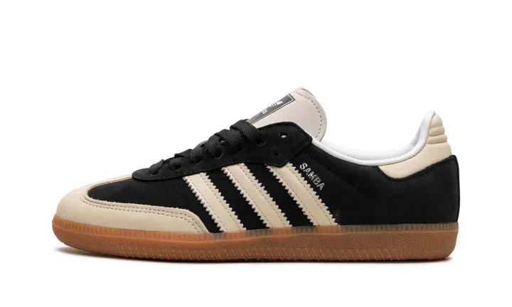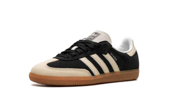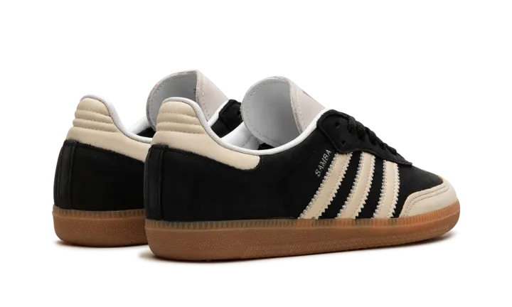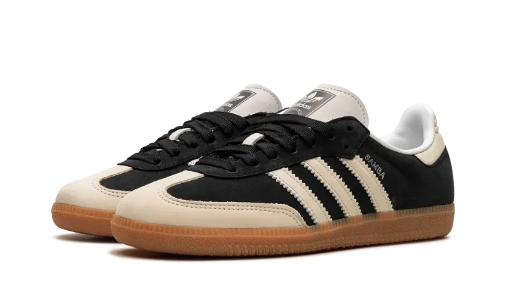 The Women's adidas Samba OG "Black/Wonder White" is a colorway of the classic sneaker with a two-tone, black-and-cream design. The upper features a Core Black suede construction with a Wonder White leather overlay on the toe that matches the hue of the leather Three Stripes branding found on the sides. "Samba" detailing appears on the lateral side of the shoe and an "adidas Samba" patch can be found on the tongue. Underfoot, a gum rubber sole completes the clean look. Release date: December 15, 2023