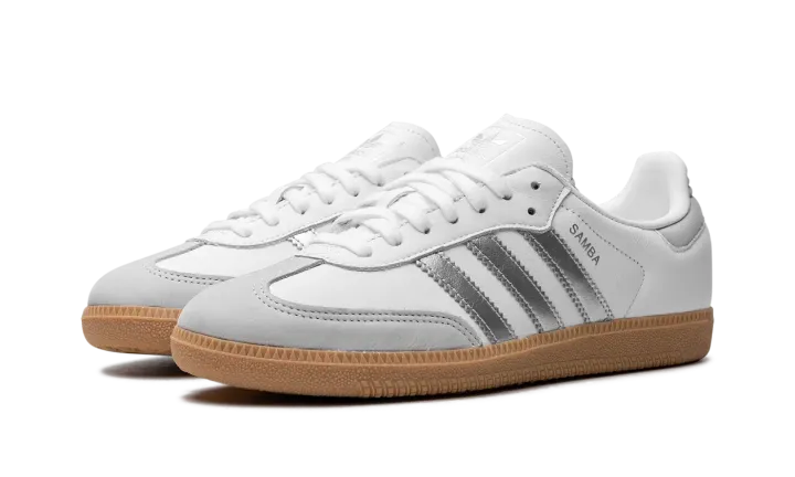 Step into a sleek, modern aesthetic with the Adidas Samba OG Wmns "White / Silver Metallic / Grey". This celebrated women's sneaker features a clean white leather upper accented by a shimmering Silver Metallic Three Stripes. Enjoy superior cushioning and a design that's perfect for making a stylish statement with a subtle futuristic twist.