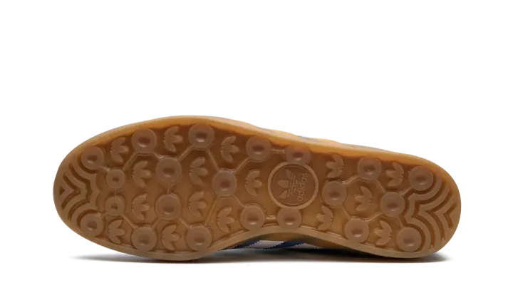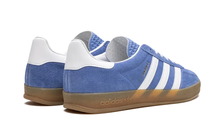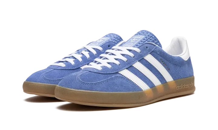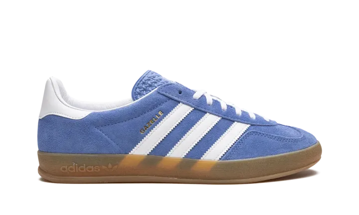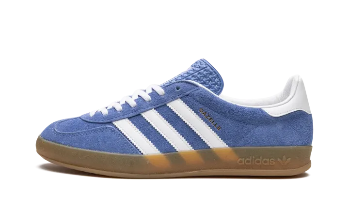 The Women's adidas Gazelle Indoor "Blue Fusion" is a women's-exclusive colorway of the retro indoor soccer shoe with a blue-based design. The upper features a Blue Fusion suede construction that gives the sneaker a head-turning look. Classic white leather Three Stripes branding appears on the sides and a gold "Gazelle" logo can be found on the lateral side of the midfoot. Additional adidas detailing is seen on the blue textured tongue. A semi-translucent rubber sole completes the look.