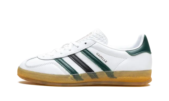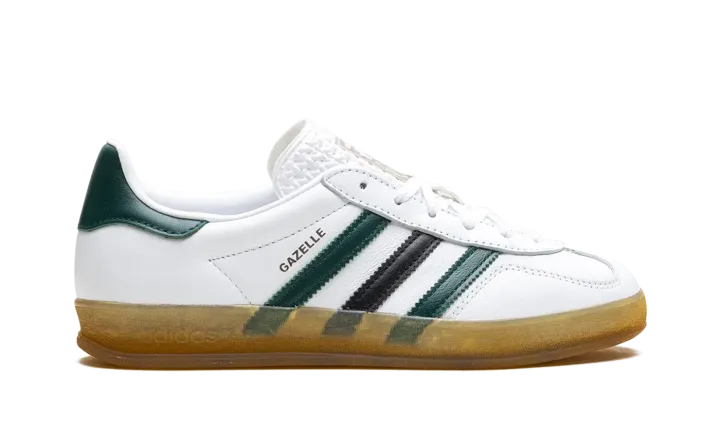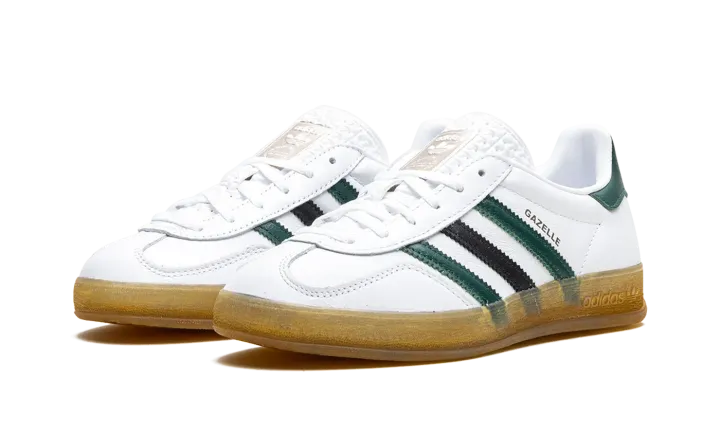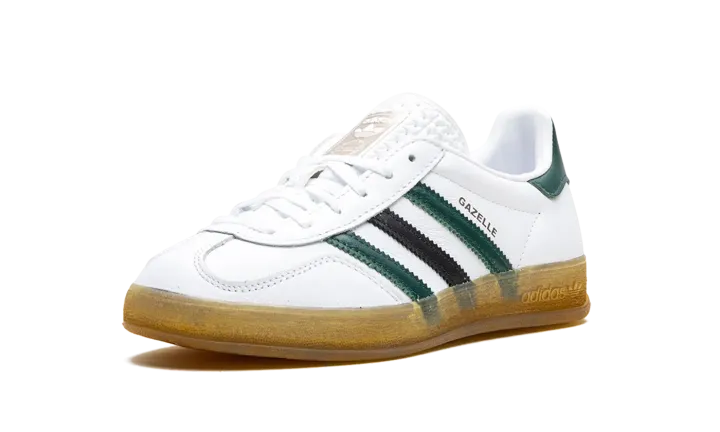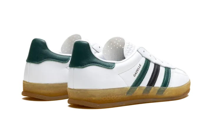 The Women's adidas Gazelle Indoor "Celtics" is the women's sizing of the retro indoor soccer shoe in a Boston Celtics-inspired colorway. While not associated with the NBA team, the "Celtics" adidas Gazelle Indoor features the Celtics uniform colors on its design, giving the shoe a classic look. The upper is complete with a white leather base, while green and black leather Three Stripes appear on the sides. A gold "Gazelle" logo can be seen on the lateral side of the mid-panel, while a green leather panel appears on the heel. Classic "adidas" detailing is located on the tongue. A semi-translucent gum rubber sole completes the look.