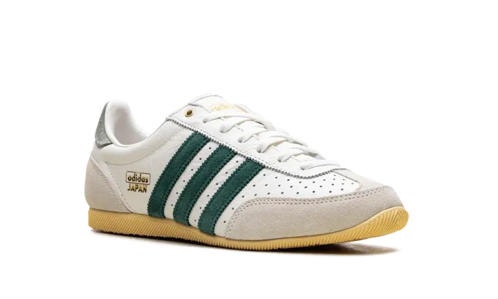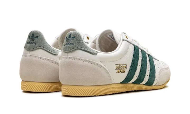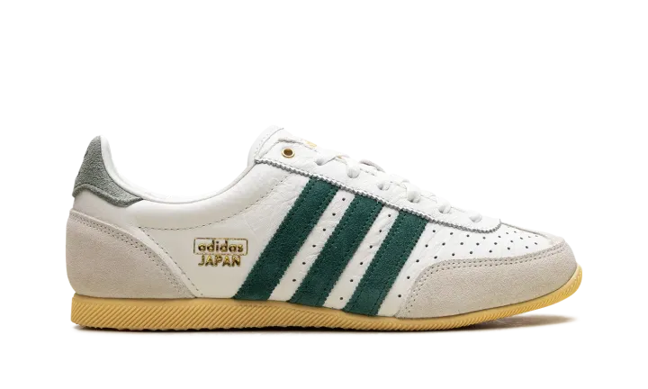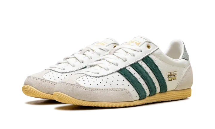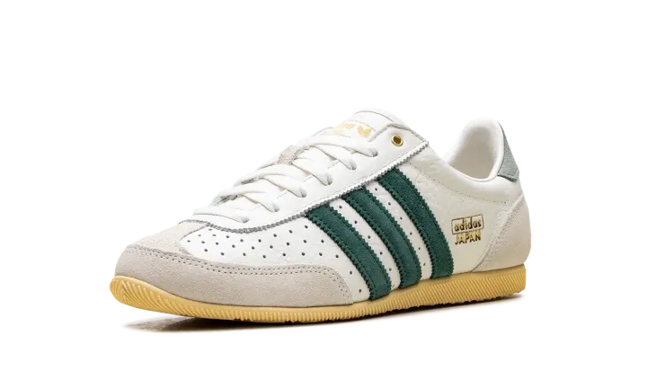 Relive a piece of athletic history with the Adidas Japan Wmns "Off White Collegiate Green" sneaker. A faithful reissue of a 1964 trainer, this shoe keeps the iconic slim, low-profile design that launched in Japan. The vintage look is perfected with a tumbled perforated leather upper in Off White, accented by the Collegiate Green serrated 3-Stripes. Classic details like the double-stitched T-toe and a durable rubber outsole offer a clean, premium, and versatile style for your everyday rotation.