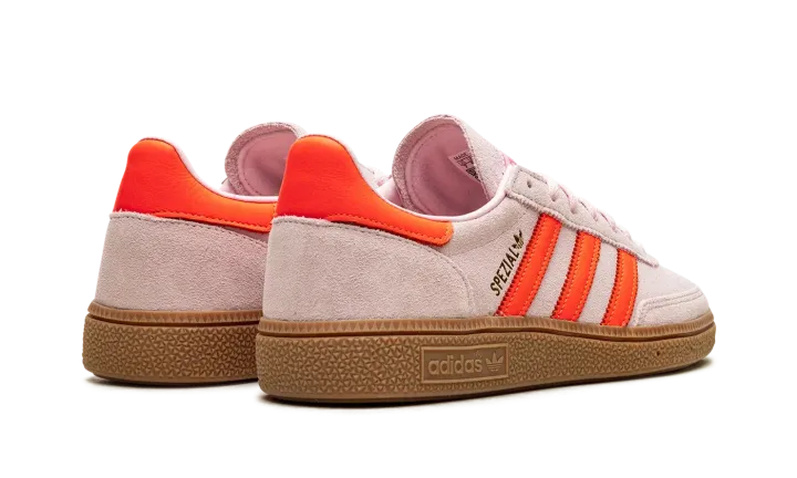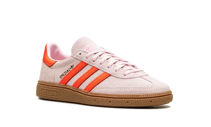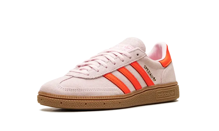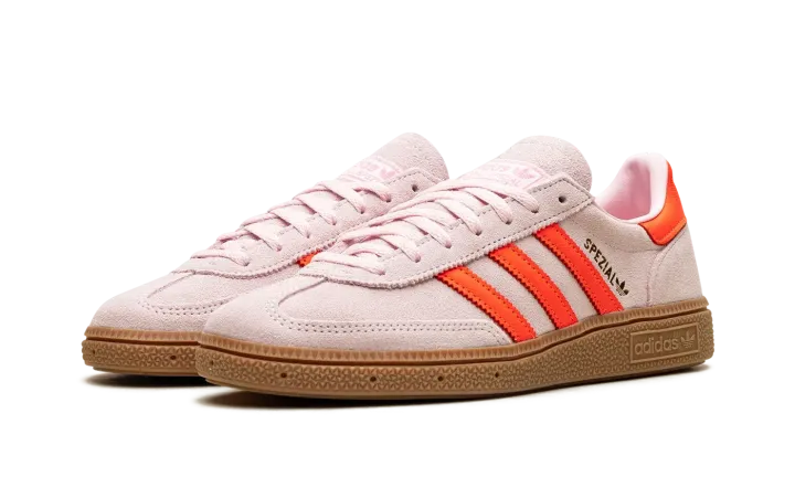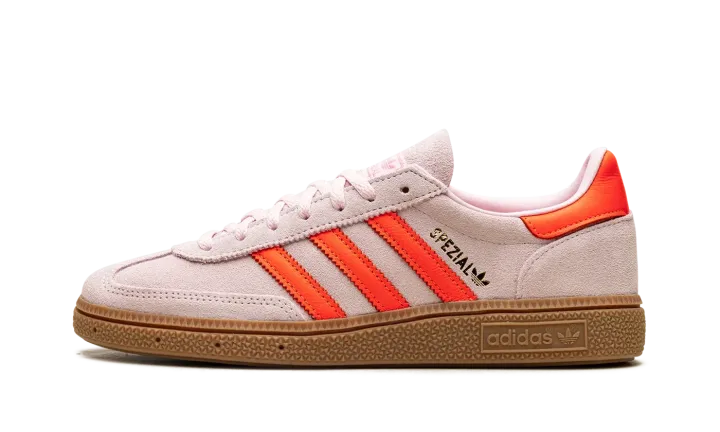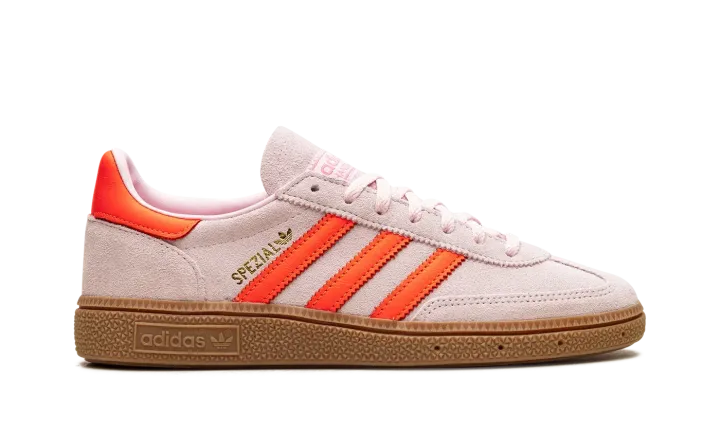 Step into a vibrant aesthetic with the Adidas Handball Spezial Wmns "Clear Pink / Solar Orange". This celebrated women's sneaker features a soft Clear Pink suede upper complemented by striking Solar Orange accents and a classic gum sole. It delivers a comfortable fit and a versatile look that's perfect for making a sophisticated statement every day.