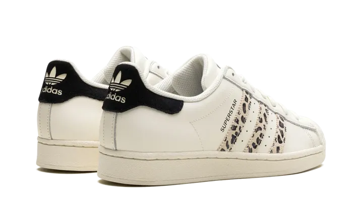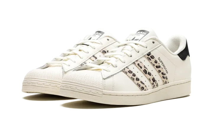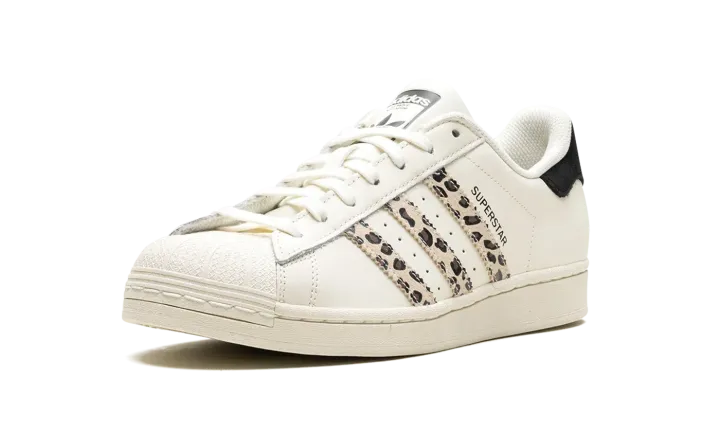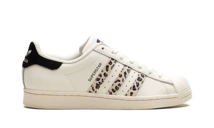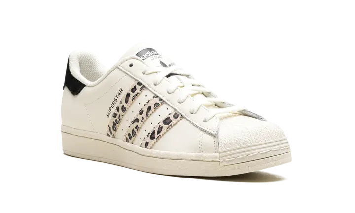 The Superstar WMNS 'Off White Black Leopard' shoe features a classic design with a bold leopard print, offering a versatile and stylish addition to any sneaker collection.
