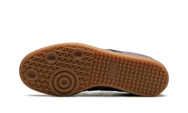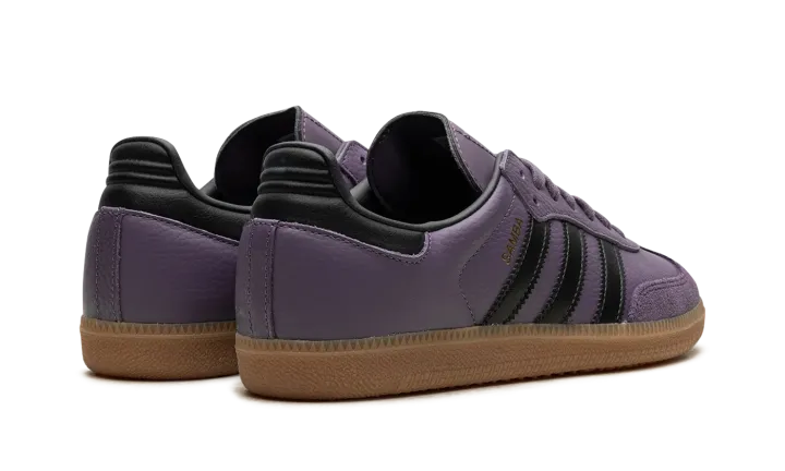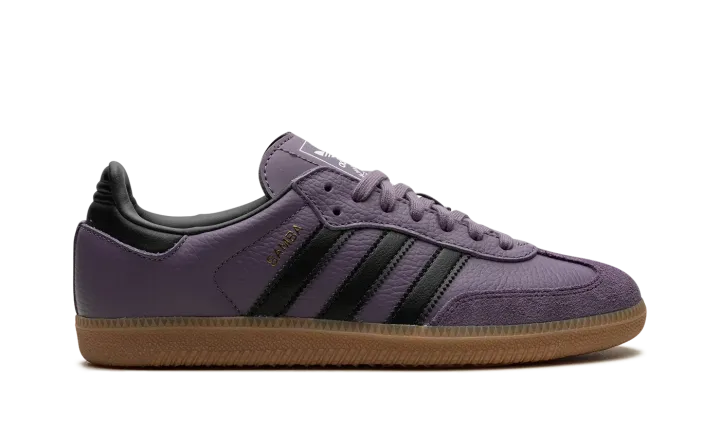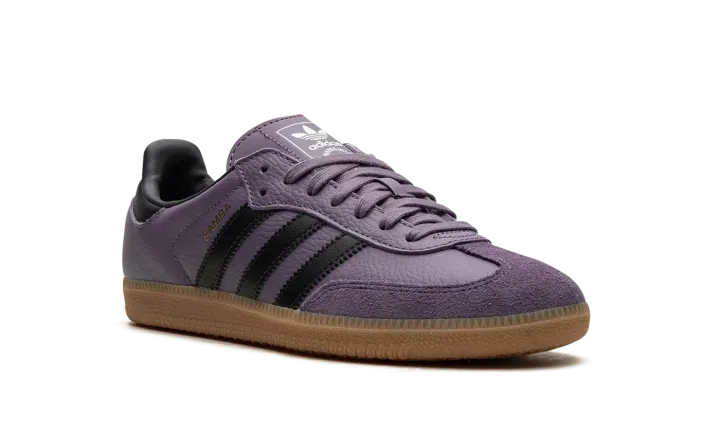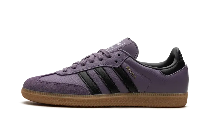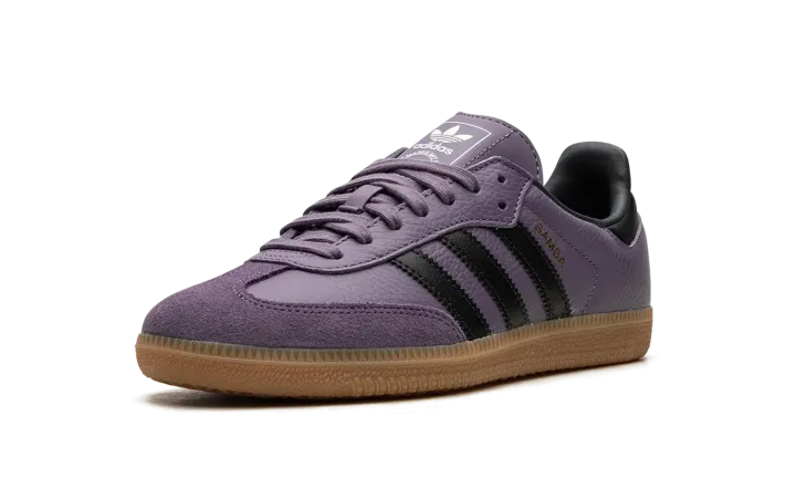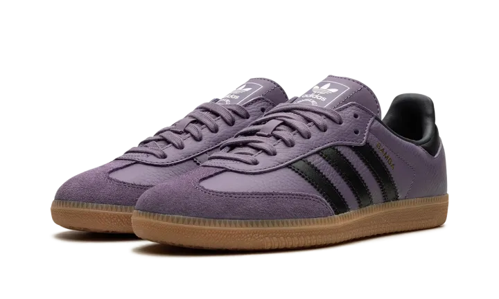 The Women's adidas Samba OG "Shadow Violet" is a women's colorway of the retro indoor soccer sneaker with a purple-based appearance. The shoe is complete with a Shadow Violet leather upper and tonal suede overlays. The Three Stripes branding on either side of the shoe is rendered in black leather. A gold "Samba" logo appears on the lateral side of the mid-panel. Classic adidas insignia is found on the tongue. A gum rubber sole finishes off the appealing colorway. Release date: August 15, 2023