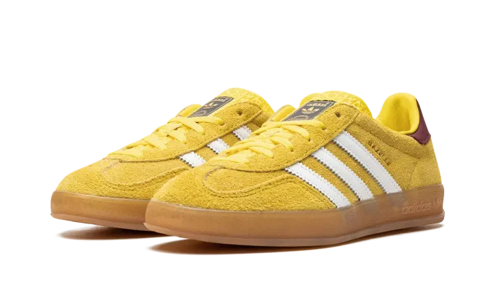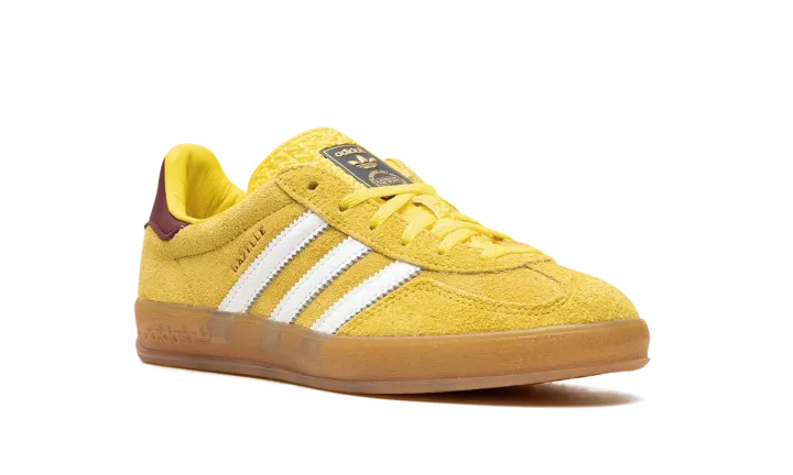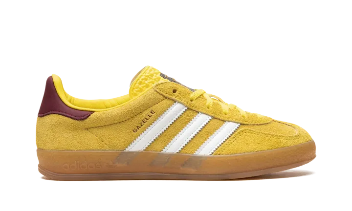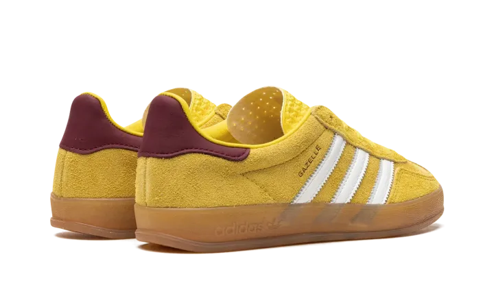 The Women's adidas Gazelle Indoor "Bright Yellow" is a women's colorway of the retro indoor soccer sneaker with a yellow-based design. An eye-catching look, the adidas Gazelle Indoor in "Bright Yellow" features a bold, yellow suede construction with a tonal suede overlay on the toe. Contrasting white leather Three Stripes and gold "Gazelle" branding can be seen on the side of the shoe. A brown leather heel tab adds a contrast of color to the shoe's mostly yellow look. A semi-translucent gum rubber sole completes the design.