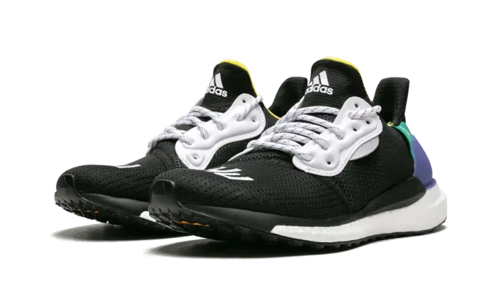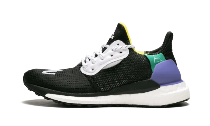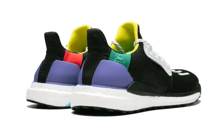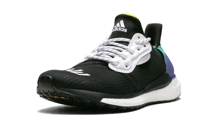 Pharrell and Adidas joined efforts to pay tribute to the incredible sport of running with the Adidas SolarHU Glide silhouette. For the collection, the Pharrell looked to Africa for inspiration, where the culture is vibrant, and running is a state of meditation. This women's Adidas SolarHU Glide is primarily black and white, with pops of bright purple, cyan, red, and yellow. Equipped with Boost technology, the Adidas running sneaker has a large Hu stamp on the top of the foot.