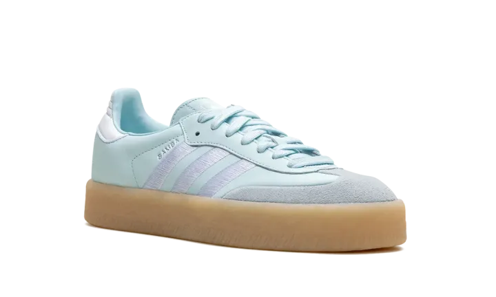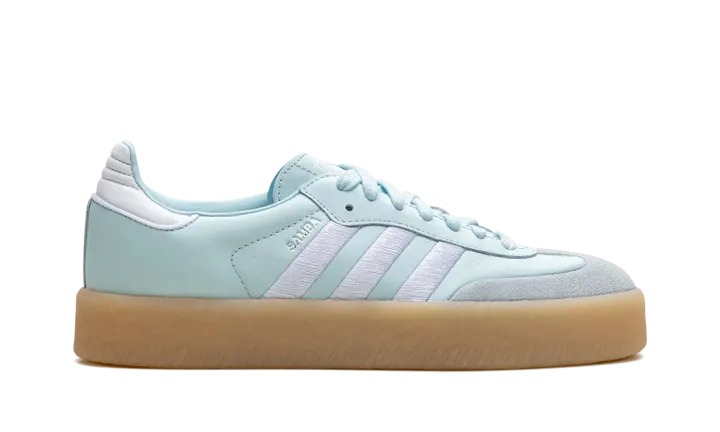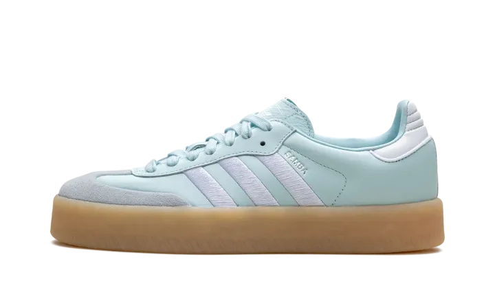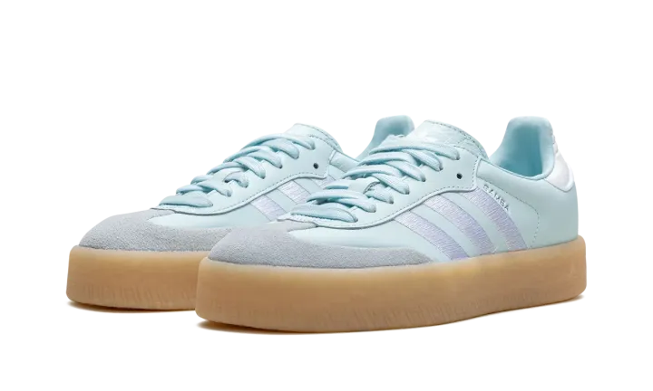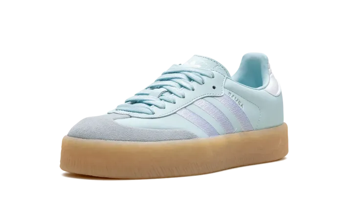 The Women's adidas Sambae "Almost Blue/Silver Metallic" is a women's-exclusive colorway of the version of the retro shoe with a platform sole. Based on the adidas Samba OG, the adidas Sambae features contemporary details such as a thick rubber midsole that gives the shoe a platform-style appearance. On this colorway, the upper has an Almost Blue leather construction with oversized white embroidered Three Stripes on the sides. A white leather panel appears on the heel, while classic adidas branding can be found on the tongue. The platform sole in gum rubber completes the look.