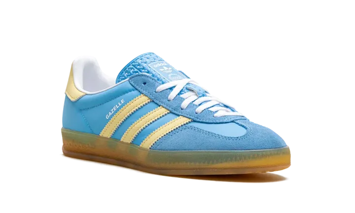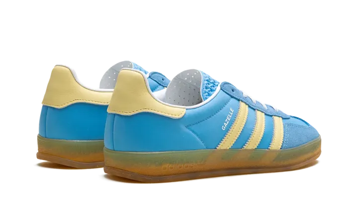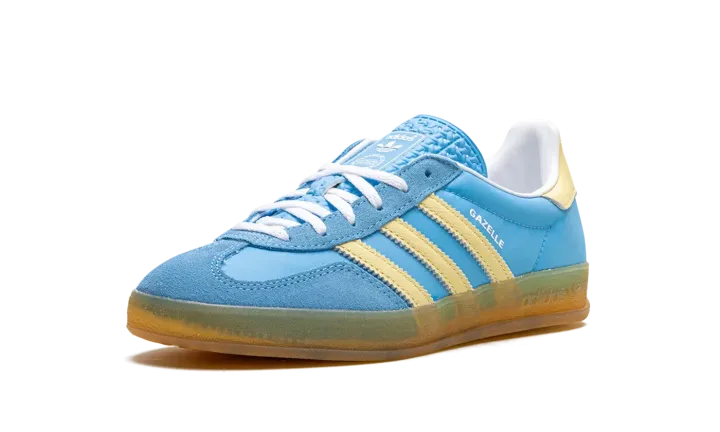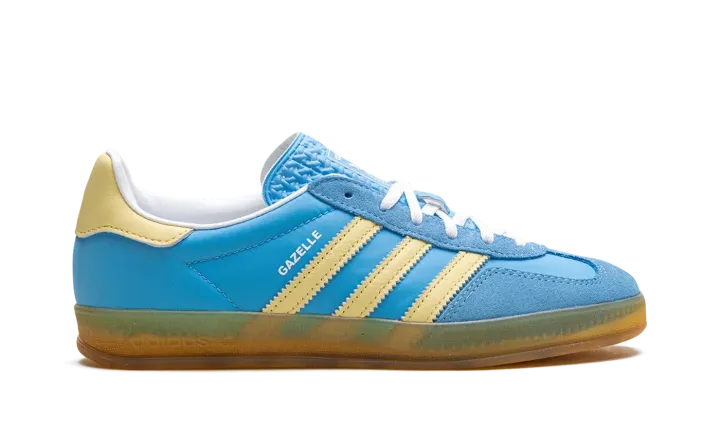 The Women's adidas Gazelle Indoor "Semi Blue Burst/Almost Yellow" is a women's-exclusive colorway of the casual shoe with a bold, blue-based appearance. The upper has what adidas calls a Semi Blue Burst-colored leather base contrasted with Almost Yellow Three Stripes branding on the sides. More Almost Yellow accenting can be found on the leather heel tab. Classic "adidas" branding is located on the tongue, while white "Gazelle" branding is printed on the lateral side of the mid-panel. A semi-translucent gum rubber sole completes the look.