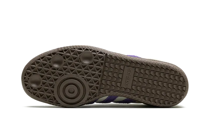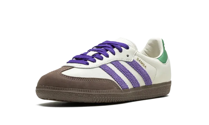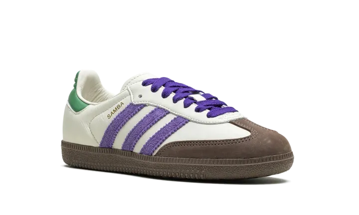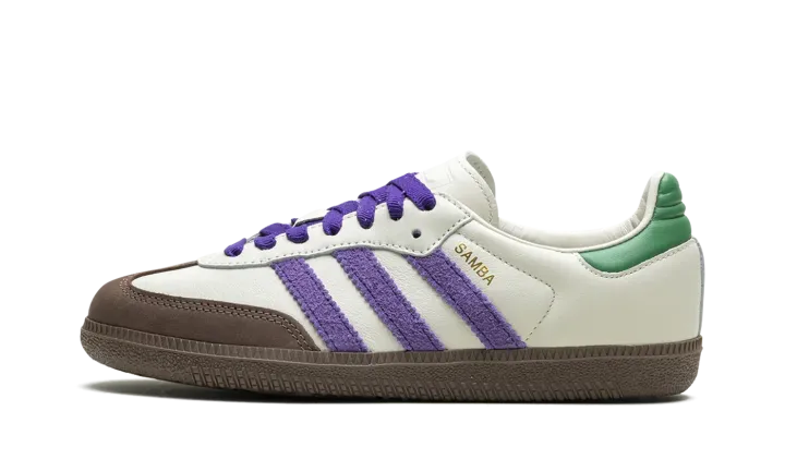 The Women's adidas Samba OG "Collegiate Purple" is a women's-exclusive colorway of the classic sneaker with a multi-color look. The upper features a white leather base that is contrasted with a brown suede overlay on the toe, and a green leather panel on the heel tab. Collegiate Purple suede Three Stripes appear on the sides, while a gold foil "Samba" logo can be seen on the lateral side of the mid-panel. Classic adidas Samba detailing is printed on the tongue. A brown rubber sole completes the look.