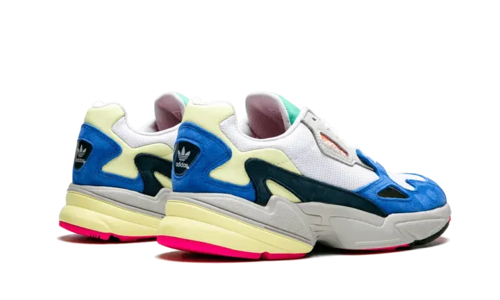 The adidas Falcon W "Cloud White/Blue" is a stylish colorways of the premium silhouette by adidas Originals. Specifically for women, the Falcon combines a vintage running shoe aesthetic with elevated materials and unique color combinations for a style-driven sneaker for modern times. The adidas Falcon W "Cloud White/Blue" features a mix of neutral and vibrant tones, including a white mesh base with bright blue suede overlays and muted yellow, hot pink, light green, and coral orange accents throughout the upper and sole. A metallic accent at the toe completes the eye-catching look.