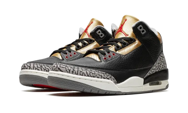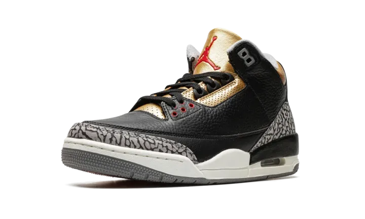 The Women's Air Jordan 3 "Black Cement Gold" is a women's-exclusive release of the retro basketball shoe that updates one of the model's original colorways with flashy gold accenting. The shoe we're referring to is the Jordan 3 "Black Cement," which was originally released in 1988 and worn by Michael Jordan during the '88 NBA All-Star Game. Here, the "Black Cement Gold" replicates the original style's black leather construction with grey elephant accenting, and adds Metallic Gold detailing to the perforated leather collar, eyelet panel, and tongue. A red Jumpman appears on the tongue, and a white Jumpman is located on the heel. The cream-colored foam midsole gives the shoe a vintage look. Release date: October 6, 2022