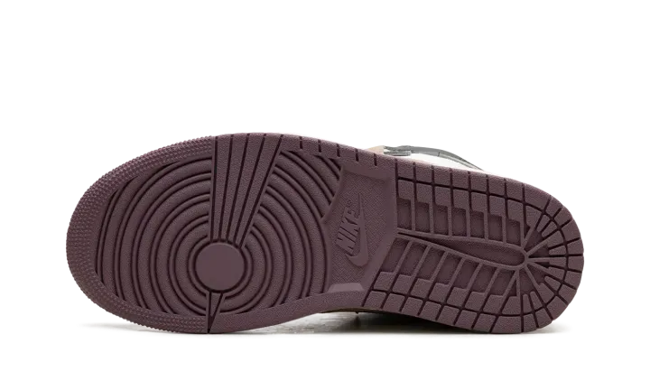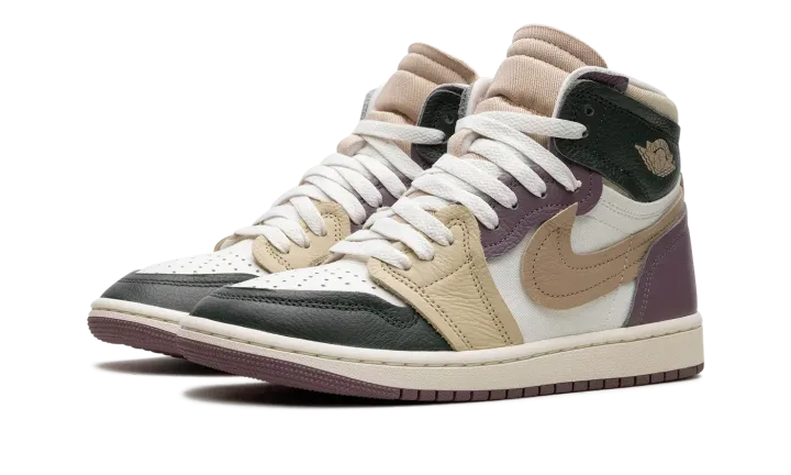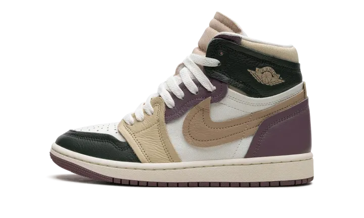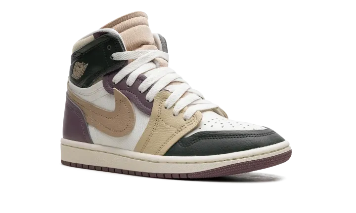 The Women's Air Jordan 1 High MM "Galactic Jade" is the women's sizing of the alternate version of the retro basketball shoe with a layered aesthetic. Designed in a unique combination of leather and canvas, the shoe also has layered and raised overlay panels that give the design a head-turning look. The upper features a Sail leather base with a dark green leather toe cap and dark green collar, a tan raised leather forefoot panel, and raised purple eyelet and heel panels. A raised tan leather Swoosh appears on both sides. A "Wings" logo is seen on the collar. Release date: November 2, 2023