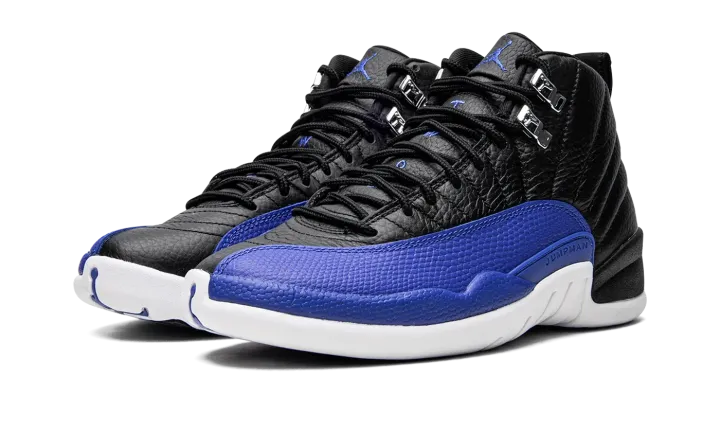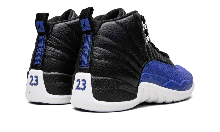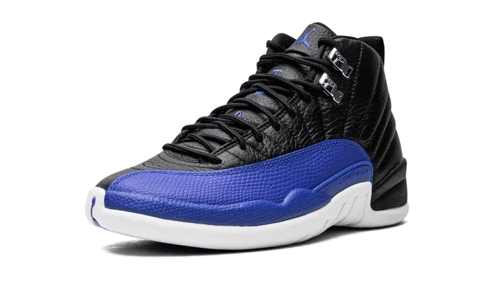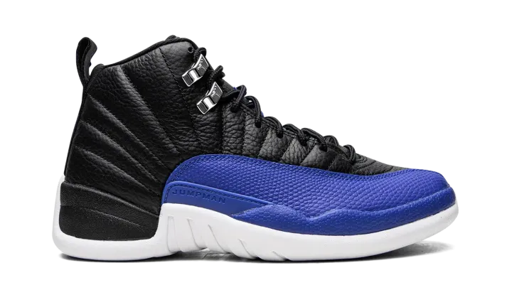 The Women's Air Jordan 12 "Hyper Royal" is a women's-exclusive colorway of the retro basketball shoe that was released in October 2022. The "Hyper Royal" draws loose inspiration from the Jordan 12 "Flu Game" and "Playoffs" as it features a black tumbled leather upper with a contrasting mudguard. On the "Hyper Royal," the model's signature basketball-textured mudguard appears in royal blue. Additional Hyper Royal accenting includes a royal Jumpman logo and "Two 3" branding on the tongue, "23" detailing on the back of the midsole, and Jumpman and "Celebrating 25 Years of Jordan in China" insignia on the heel. Metallic Silver eyelets and blue Jumpman branding on the outsole complete the look. Release date: October 1, 2022