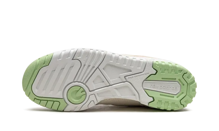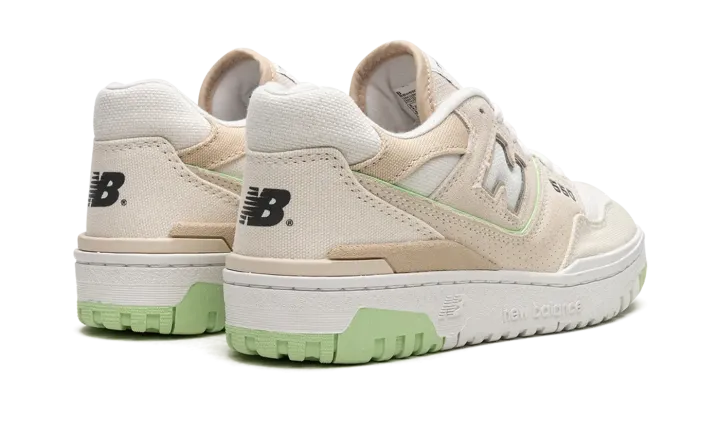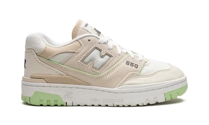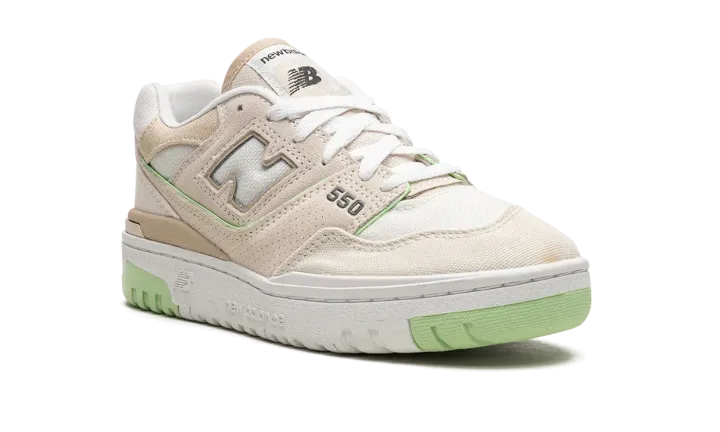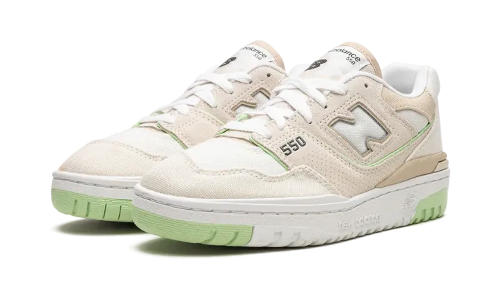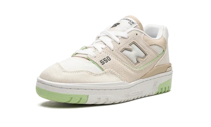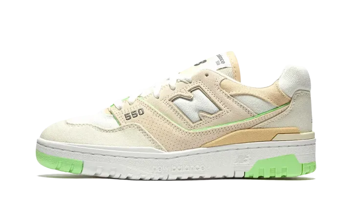 The Women's New Balance 550 "Turtledove" is a women's-exclusive colorway of the retro basketball shoe with a versatile appearance. The "Turtledove" 550 features a white mesh base with a tan canvas toe overlay and a tan suede mid-panel overlay. A white "N" logo can be found on each side of the shoe. A grey "550" logo appears on the lateral side of the forefoot and "NB" detailing is located on the heel. A classic "New Balance 550" graphic appears on the tongue. A splash of color is provided by the neon green piping along the upper's mid-panel overlay and on the rubber outsole.