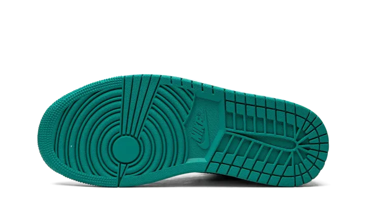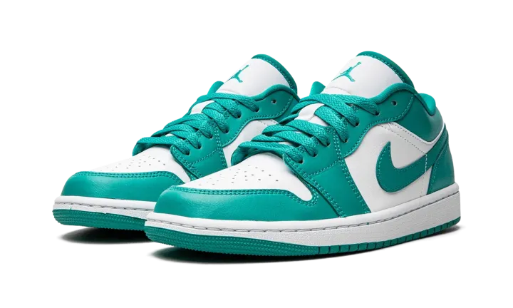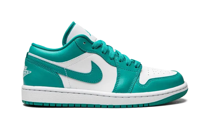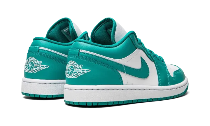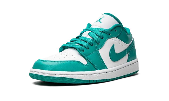The Women's Air Jordan 1 Low "New Emerald" is a women's-only colorway that calls to mind the two-tone color block of the original Nike Dunks from 1985. A classic look no matter which shoe it loosely mimics in appearance, the "New Emerald" features a white leather base with New Emerald-colored leather overlays and Swoosh branding. A white "Wings" logo is embroidered on the heel. A New Emerald Jumpman appears on the tongue. The eye-pleasing green hue is also used on the laces. Finishing touches include a white midsole and teal-colored rubber outsole.