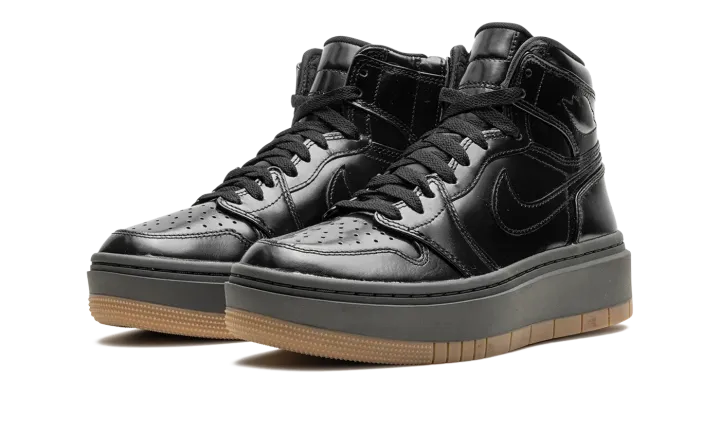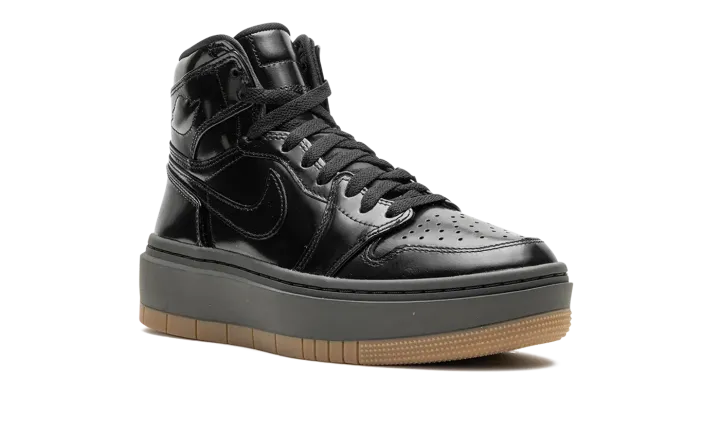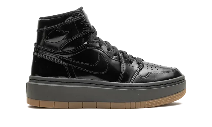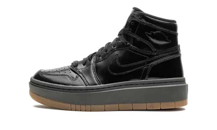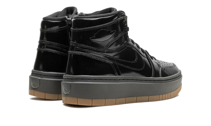 The Women's Air Jordan 1 High Elevate "Black/Gum" is a women's-exclusive colorway of the casual shoe with a platform-style sole. The Jordan 1 High Elevate updates Michael Jordan's first signature shoe with a modern look that includes an elevated, platform sole. The "Black/Gum" colorway features a shiny black patent leather construction across the upper. A black patent leather Swoosh appears on the sides. Its design and a "bubble" style "Wings" logo appears on the heel. Underfoot, the platform-style gum rubber sole completes the look. Release date: September 26, 2023