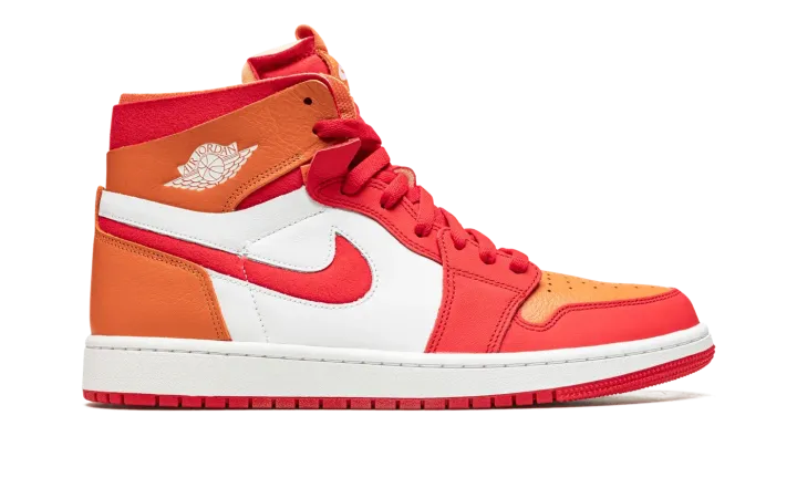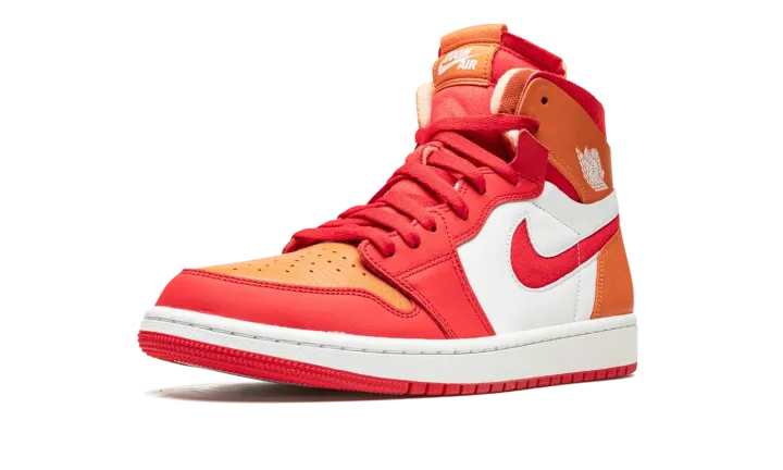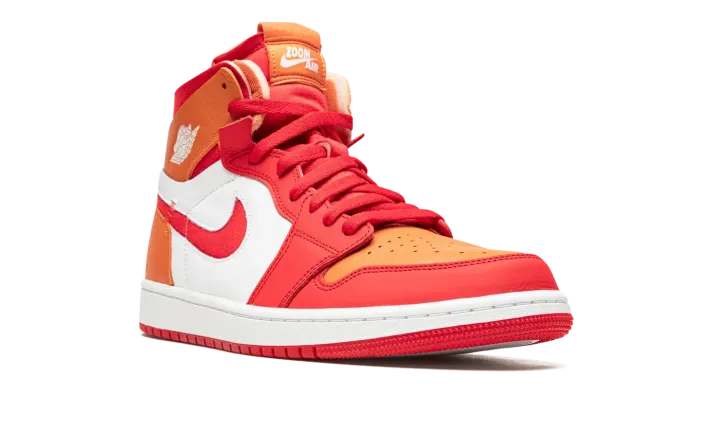 The Women's Air Jordan 1 High Zoom CMFT "Fire Red/Hot Curry" is a hot and spicy colorway of the alternate version of the iconic Jordan 1. The Air Jordan 1 Zoom Comfort is a modern take on the classic basketball and lifestyle shoe with design updates that include a new Zoom Air cushioned midsole and an ankle collar with even more padding than that of the Air Jordan 1 High OG model. The design features a fiery look, with Hot Curry-colored leather appearing on the perforated toe, collar, and heel. Bold Fire Red leather is found on the toe cap, forefoot, eyelets, and collar underlay. The blazing red hue is also found on the Swoosh logo on either side. A white "Wings" logo appears on the collar. Release date: July 14, 2022