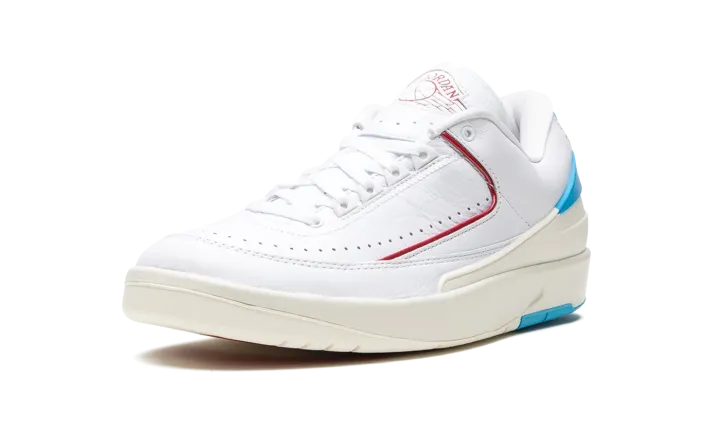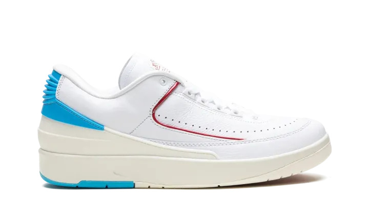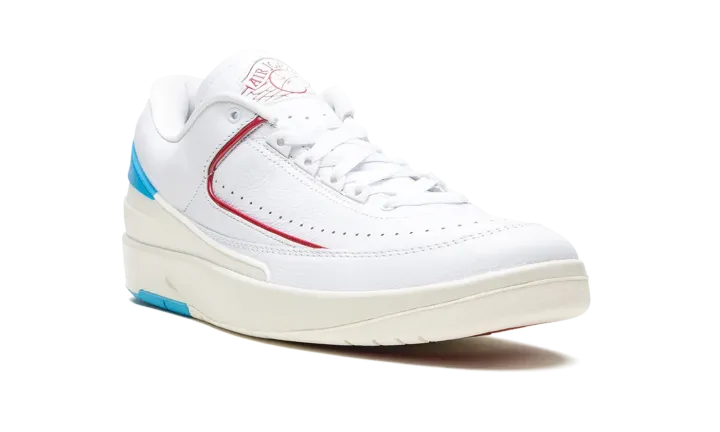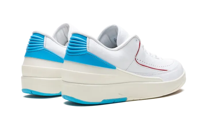 The Women's Air Jordan 2 "UNC to Chicago" is a women's-exclusive colorway of Michael Jordan's second signature shoe that shows appreciation for his two former basketball teams. Originally appearing on the Air Jordan 1, the "UNC to Chicago" theme makes its way onto the Jordan 2 Low as part of the vintage basketball shoe's comeback in 2022 and 2023. The design features the familiar color schemes of both the North Carolina Tar Heels and the Chicago Bulls, Jordan's college and professional basketball teams. The shoe features a white leather construction with contrasting University Blue accenting on the heel, which is a nod to the Tar Heels. Fiery red detailing inspired by the Bulls' primary team uniform color is found on the underlay on either side of the shoe. Red "Wings" branding appears on the tongue. The cream accenting on the back of the shoe and on the mid-panel gives the design a decidedly aged look. Release date: March 8, 2023