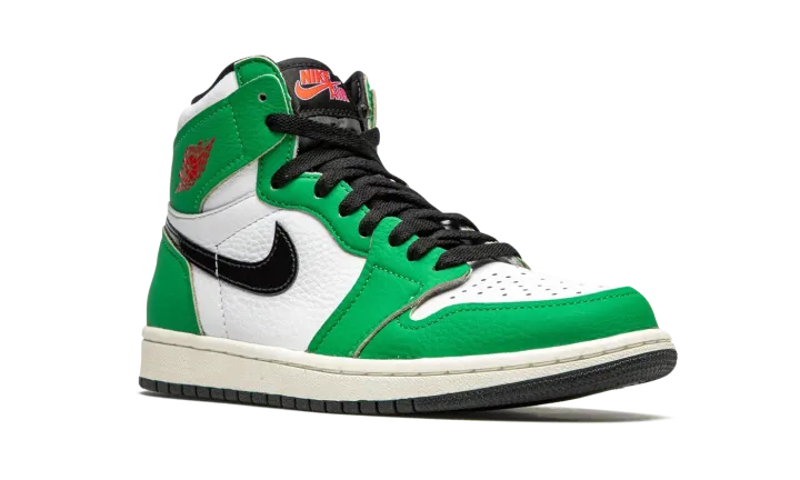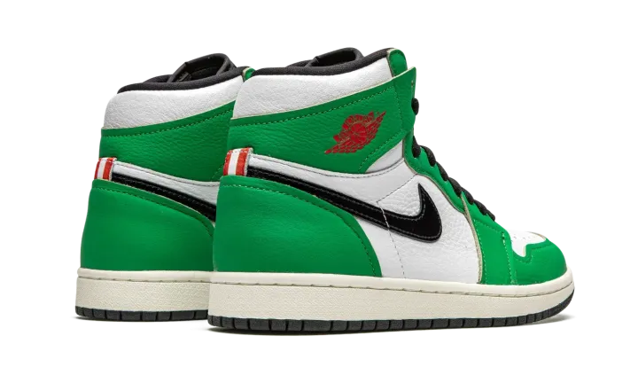The Women's Air Jordan 1 "Lucky Green" is a special women's colorway that acknowledges Michael Jordan's 63 point performance against the Boston Celtics during a 1986 NBA Playoff game. The iconic Jordan 1 shoe was Michael's shoe of choice on the day he set the NBA Playoff record for most points scored in a single game. That day, he wore the "Chicago" colorway. As for this design, the "Lucky Green" features buttery green tumbled leather overlays on the forefoot, eyelets, collar, and heel. The unstitched panels salute "progress, not perfection." The same high-quality grain of leather can be found in white on the base of the upper. Shiny black leather Swoosh detailing appears on either side, and red "Wings" branding dots the Lucky Green leather overlay on the collar. A red "Nike Air" logo is printed onto the black nylon tongue. A final nod to Michael's 63 point accomplishment comes in the form of wooden detailing printed onto the insoles. The look references the famous parquet floor of the old Boston Garden, where the Bulls vs. Celtics game took place. Release date: October 14, 2020.