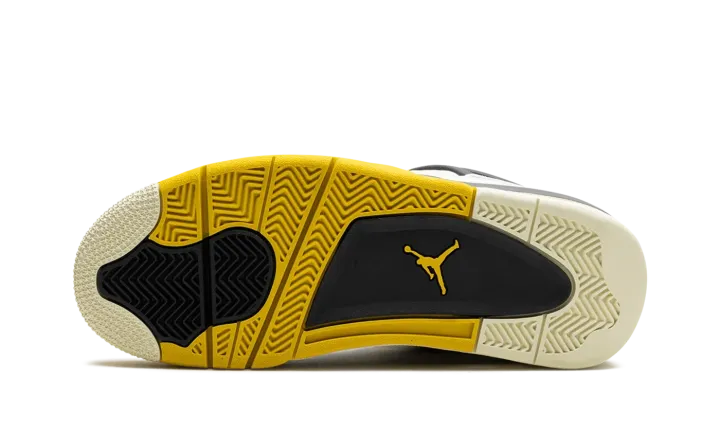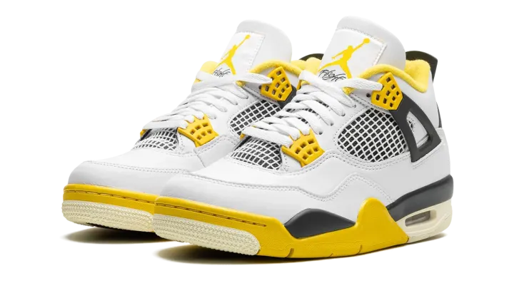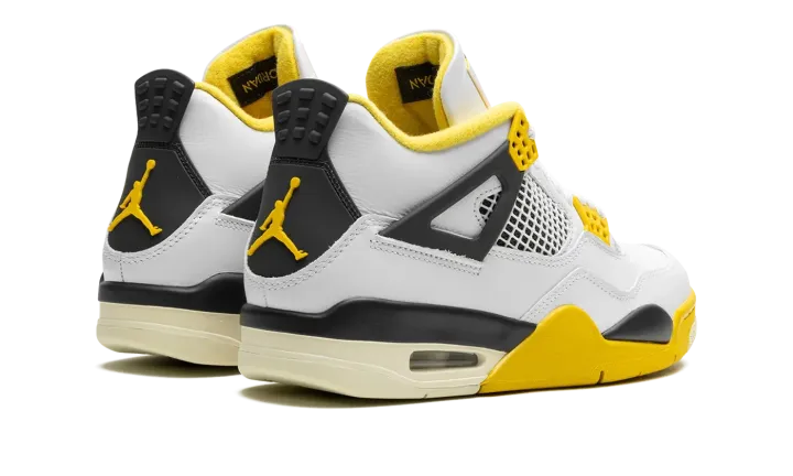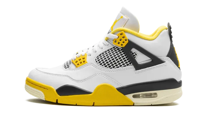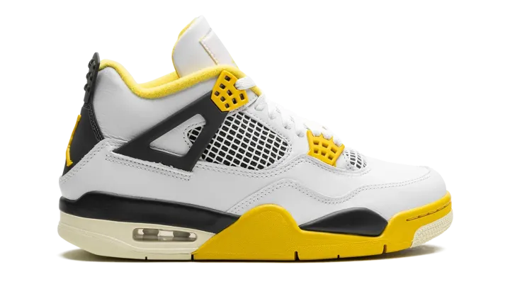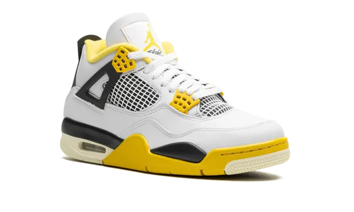 The Air Jordan 4 "Vivid Sulfur" is a colorway of Michael Jordan's fourth signature shoe with yellow accents. Released in celebration of the Jordan 4's 35th anniversary in 2024, the "Vivid Sulfur" features a white leather upper with black "wings" and a black underlay beneath the white netting on the mid-panel and tongue. Vivid Sulfur accenting appears on the eyelet tabs, the Jumpman on the tongue, the inner lining, and on the midsole. More Vivid Sulfur detailing appears on the Jumpman on the black heel counter. Underfoot, a visible Air unit in the heel of the midsole completes the look. Release date: April 6, 2024