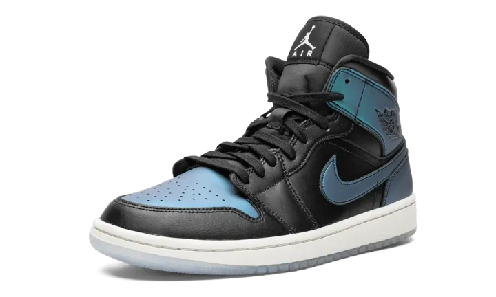 The Nike Air Jordan 1 Mid "Iridescent" is the women's sizing of Michael Jordan's first signature Nike sneaker, chopped down in mid-top form. Retaining similar traits of its high-top relative, the Air Jordan 1 Mid offers a comfortable fit and a slightly different take on the classic design. Here, donning a unique iridescent vibe, the Air Jordan 1 Mid features a black leather base on the mid-panel, eyelets, and toe cap. The aforementioned iridescent colorway appears on the Swoosh-branded mid-panel, on the perforated toe, and on the lateral panel of the silhouette. A black nylon tongue with black Wings branding near the collar adds depth to the appearance. Rounding out the design of the Nike Air Jordan 1 Mid "Iridescent" in women's sizing is a white rubber midsole with a translucent white outsole.