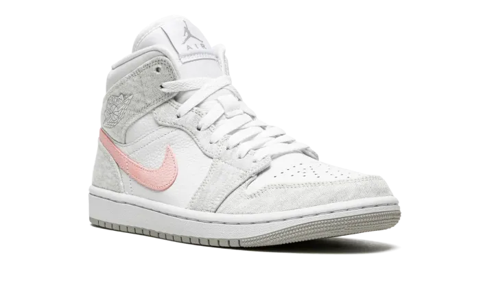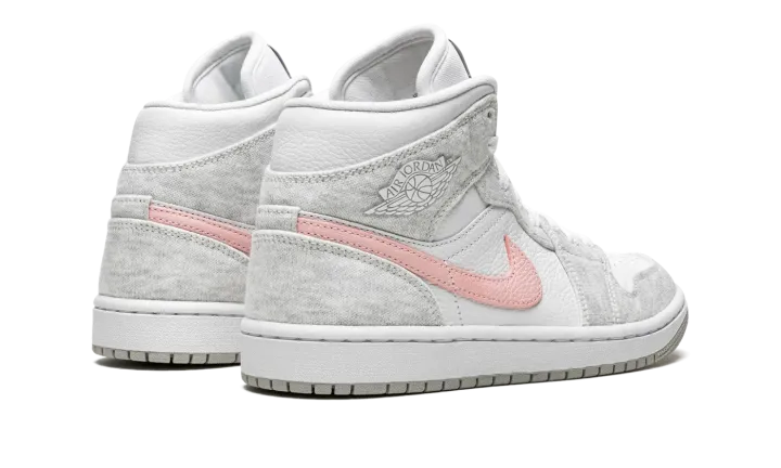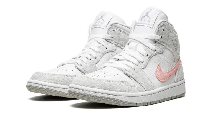 The Women's Air Jordan 1 Mid SE "Heather Grey/Pink" is a casual colorway of the women's version of Michael Jordan's first signature shoe. From Jordan Brand's Spring 2022 collection, the "Heather Grey/Pink" features heather grey canvas overlays against a crisp white tumbled leather base. A pink leather Swoosh is found on both sides of the shoe and a tonal "Wings" logo is located on the collar. On the tongue, a silver Jumpman with "Air" branding adds a classic Jordan 1 look. Underfoot, a white rubber midsole and grey outsole complete the look.