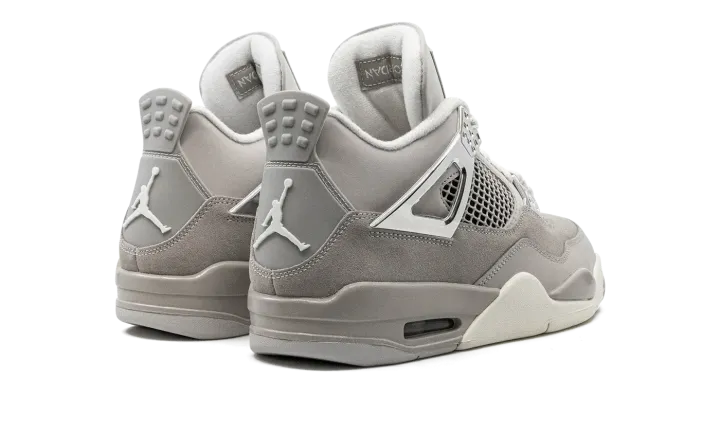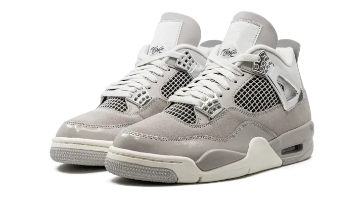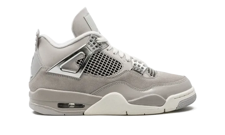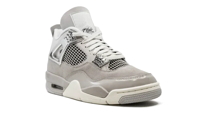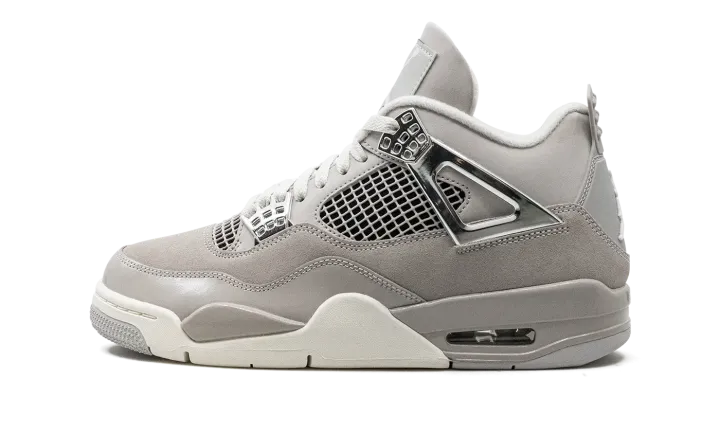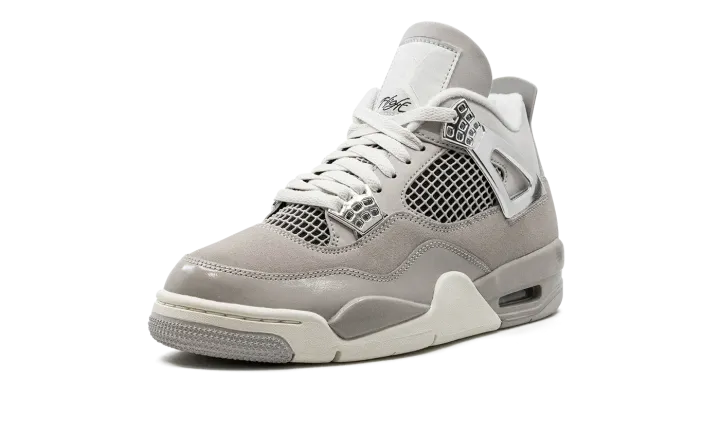 The Women's Air Jordan 4 "Frozen Moments" is a women's-exclusive colorway of Michael Jordan's fourth signature shoe with a versatile appearance. The "Frozen Moments" features a Light Iron Ore suede construction with tonal overlays. White netting is seen on the tongue and mid-panel. The "wings" on the collar and eyelets are finished off in Metallic Silver. Classic Jumpman branding is located on both the tongue and heel. Underfoot, the grey foam midsole completes the look. Release date: August 26, 2023