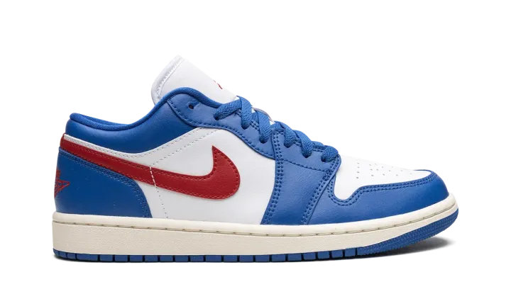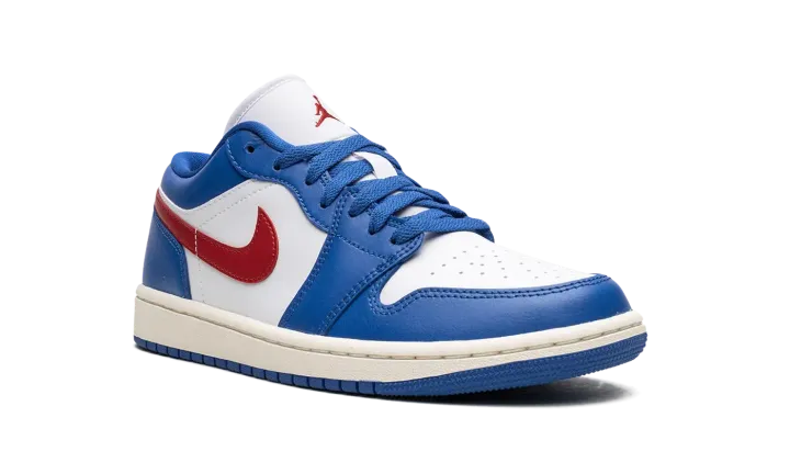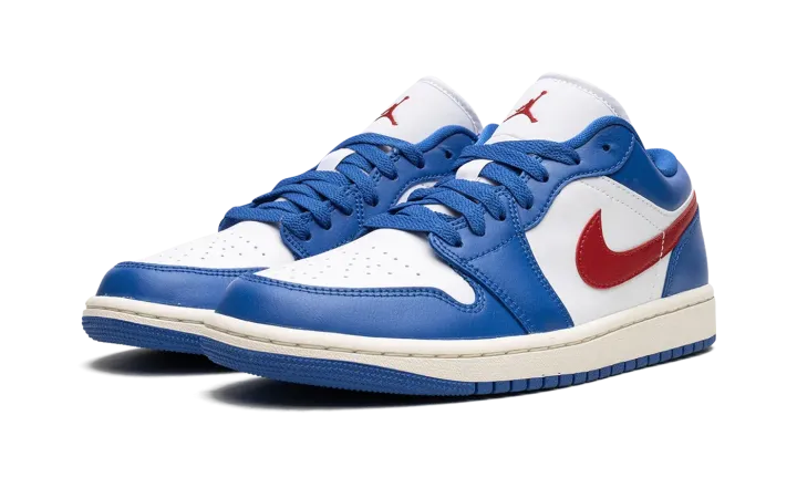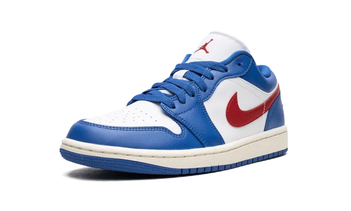 The Women's Air Jordan 1 Low "Sport Blue" is a women's-exclusive colorway of the retro basketball shoe with a patriotic look. The "Sport Blue" features a red, white, and blue color scheme that is not only patriotic but also a subtle nod to the color combination found on the Air Jordan 3's original "True Blue" colorway. Here, the shoe has a white leather base with Sport Blue leather overlays. A Gym Red leather Swoosh is found on the sides and a red "Wings" logo is embroidered on the heel. A red Jumpman is embroidered on the white nylon tongue. Underfoot, an off-white-colored rubber midsole and blue rubber outsole complete the look.
