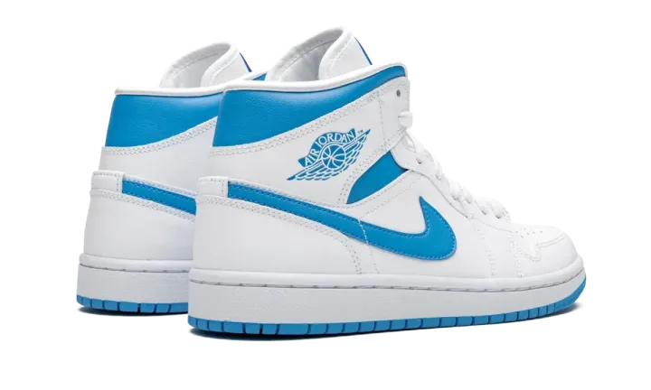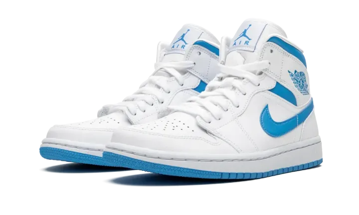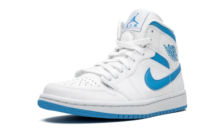 The Air Jordan 1 Mid "UNC" draws inspiration from Michael Jordan's alma mater for a fresh new look on the mid-top silhouette. The famous University Blue of the University of North Carolina shines bright on this eye-pleasing colorway of the Jordan 1 Mid with the color covering the Swooshes and collar. A white leather base spans the perforated toe, mid-panel and heel. Additional hits of Carolina Blue can be found on the Wings logo on the collar and Jumpman branding on the white nylon tongue tab. Jordan Brand opts for an always classy white rubber midsole and contrasting light blue outsole to finish off the styling of the shoe. The Air Jordan 1 Mid "UNC" was released on January 14, 2020.