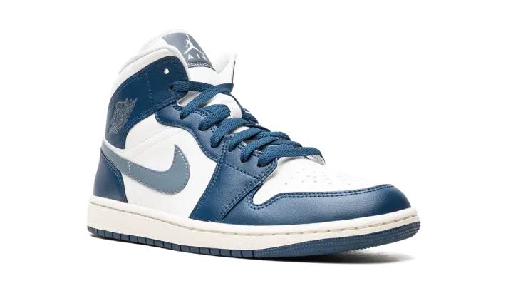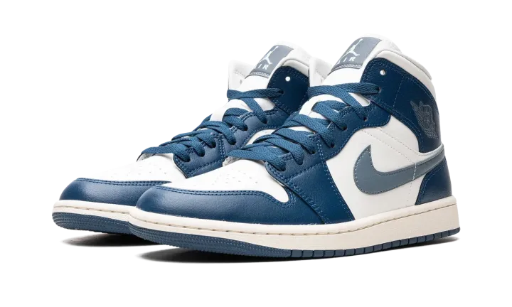 The Women's Air Jordan 1 Mid "French Blue" is a women's-exclusive colorway of lifestyle shoe with an appealing color block. The upper features a Sail (off-white) leather base with French Blue leather overlay panels. An Ozone Blue leather Swoosh appears on both sides. A grey "Wings" logo can be found on the collar overlay while a white Jumpman is seen on the grey nylon tongue tag. Underfoot, a Sail rubber midsole and French Blue outsole complete the clean look. Release date: August 31, 2023