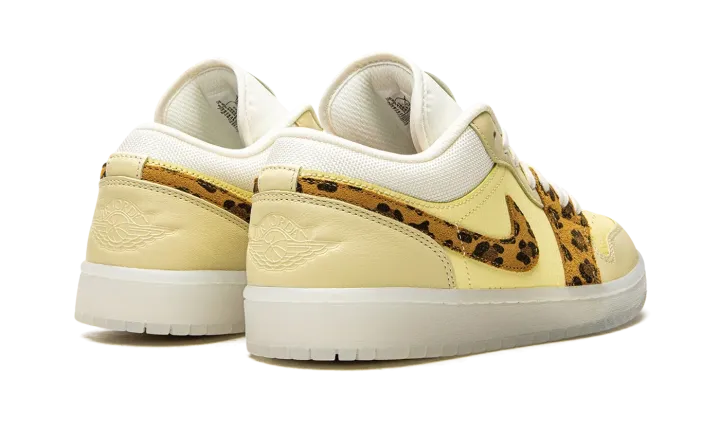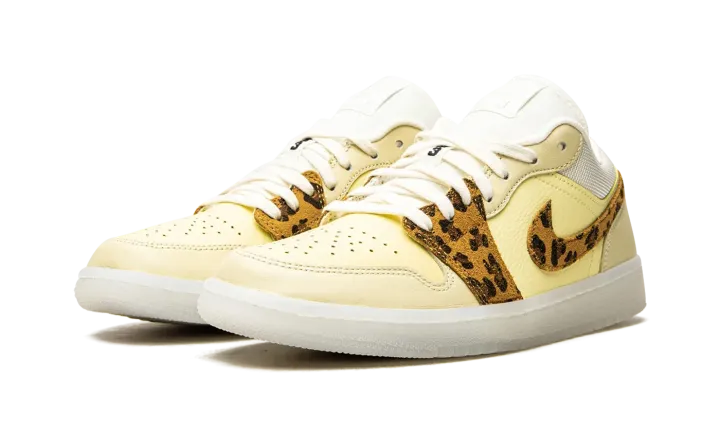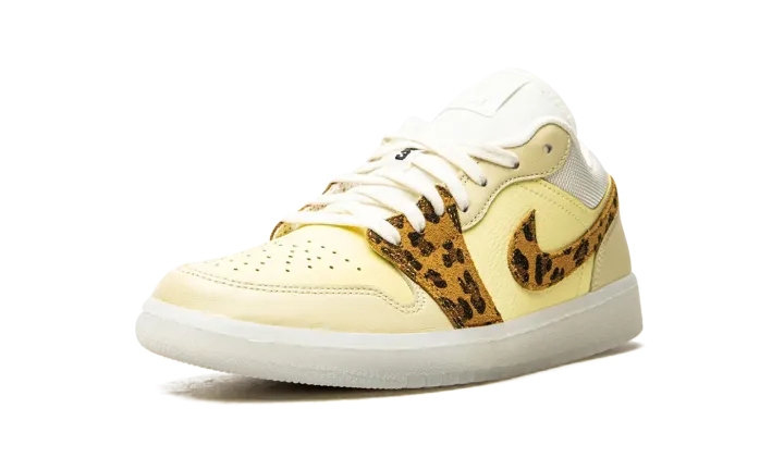 The Women's Air Jordan 1 Low "SNKRS Day" is an August 2021 release of the women's version of the vintage basketball shoe that shows appreciation for the fourth anniversary of Nike SNKRS app in Europe. This exploratory look for Michael Jordan's first signature shoe features leopard print on the forefoot and Swoosh. The base is arranged in a combination of cream and yellow leather panels. A tonal ball-and-wings logo appears on the heel and a white debossed Jumpman with "Air" branding highlights the look of the white leather tongue tag. Black "23" detailing on the lace overlay completes the look. Release date: August 8, 2021
