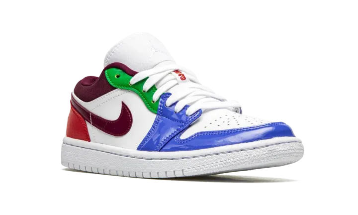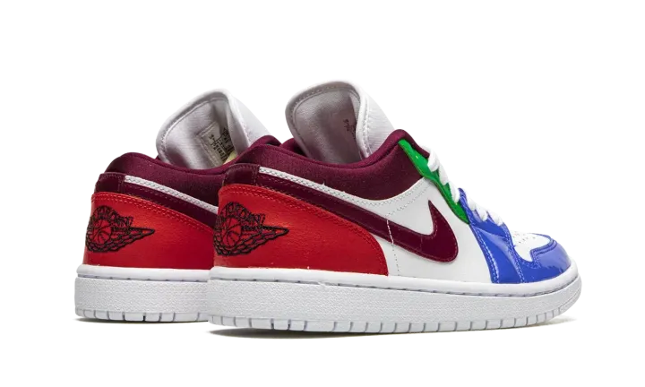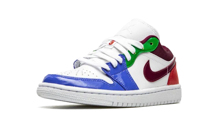 The Women's Air Jordan 1 Low SE "White/Multicolor" mixes colors and materials on Michael Jordan's first signature shoe in the desirable low-top silhouette. Fitted in women's sizing, the aptly named "White/Multicolor" indeed joins different shades of color together for a unique look in and of itself. The perforated toe and mid-panel display a smooth variety of white leather while the forefoot and toe cap are composed of a glossy blue patent leather material. The varied look of the shoe continues on the green leather eyelets and again on the Beetroot shade of maroon used on the padded collar and leather Swoosh on either side. A black embroidered "Wings" emblem appears on the fiery shade of red leather on the back of the shoe. Tonal Jumpman detailing can be found on the white nylon tongue. Red "23" branding on the lace overlay adds a subtle pop of color to the top of the Women's Jordan 1 Low in the "White/Multicolor" design.