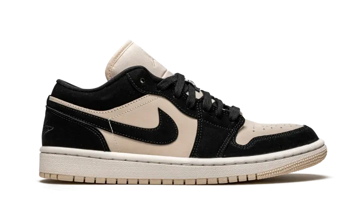 The Women's Air Jordan 1 Low "Black/Guava Ice" employs a predominantly two-tone color block of neutral colors on the women's sizing of Michael Jordan's first signature shoe. This Jordan 1 Low features black synthetic nubuck overlays on the forefoot, toe cap, eyelets, collar, and heel. Jordan Brand employs a hue of light pink or "Guava Ice" synthetic nubuck on the perforated toe, mid-panel, and nylon tongue. Branding, such as the embroidered tonal Jumpman emblem on the tongue and tonal "Wings" detailing on the back of the shoe, adds a subtle detail to the look. A black Swoosh appears on either and "23" detailing can be found on the black shoe lace overlay.
