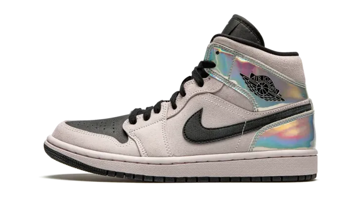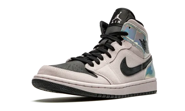 The Women's Air Jordan 1 Mid "Iridescent" is a flashy look for the women's sizing of Michael Jordan's first signature shoe in mid-top form. The unique appearance of the release can be attributed to the iridescent leather collar and heel which emits a reflective shine. Barely Rose suede covers the mid-panel, toe cap, and collar. A dotted black nylon Swoosh contrasts the mid-panel. Additional black nylon appears on the perforated toe and tongue. Jordan Brand finishes off the midsole in a tonal hue that syncs with the pale pink suede base of the shoe.