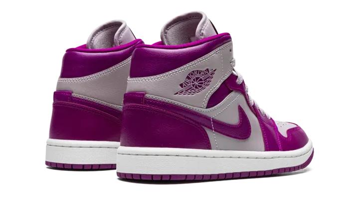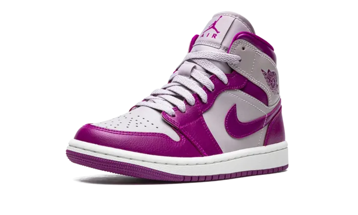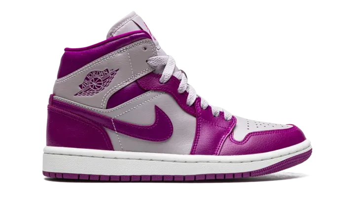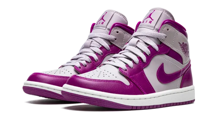 The Women's Air Jordan 1 Mid "Magenta" is a women's-exclusive colorway of the popular mid-top silhouette from Jordan Brand's Spring 2022 lineup. The "Magenta" borrows inspiration from the two-tone appearance of many classic Nike Dunk colorways, as it features violet and magenta color combination on its panels. Specifically, the perforated toe, mid-panel, and collar are designed in light purple leather. The toe cap, forefoot, eyelets, heel, and Swoosh appear in magenta leather. The dark purple hue also appears on the "Wings" logo on the collar, and on the Jumpman and "Air" branding on the tongue tag. The shoe is finished off with a white midsole and magenta rubber outsole.