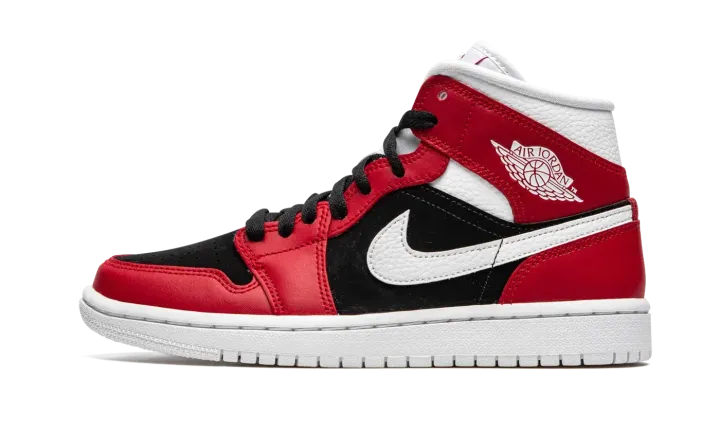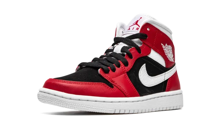 The Women's Air Jordan 1 Mid "Gym Red/Black" is Michael Jordan's first signature shoe in a Chicago-Bulls-centric colorway designed for women. A 2020 release, the "Gym Red/Black" Jordan 1 Mid continues the model's association with "The GOAT's" former ball club by featuring its team uniform colors in its design. Eye-catching Gym Red leather overlays can be found on the forefoot, toe cap, eyelets, collar, and heel. A black felt material is located on the perforated toe and mid-panel. Classic branding appears in the form of a white tumbled leather Swoosh on either side and a white leather "Wings" emblem on the collar. A red Jumpman graphic appears on the white nylon tongue tag that is stitched onto the white nylon tongue.