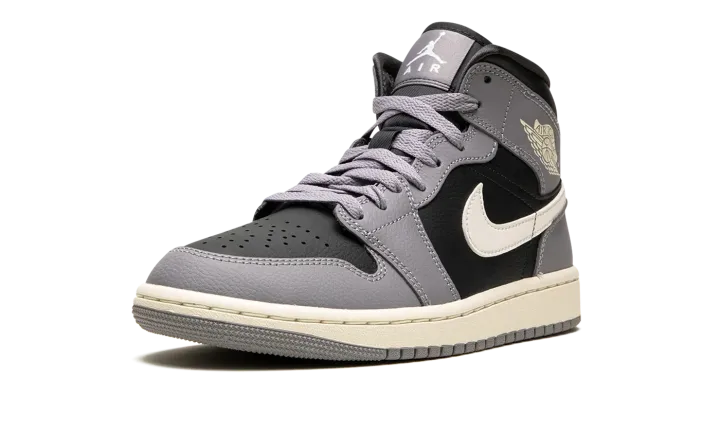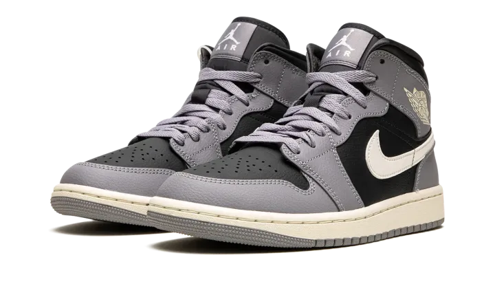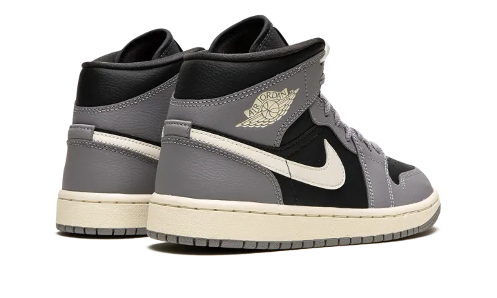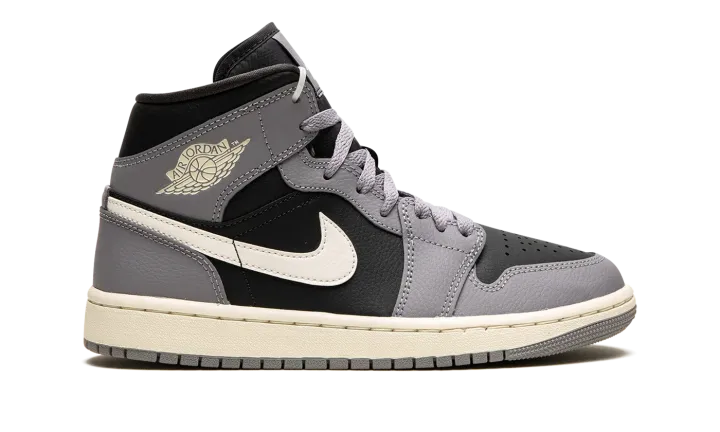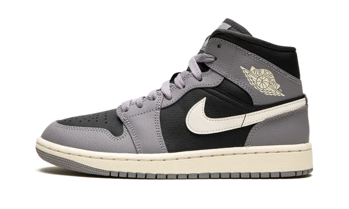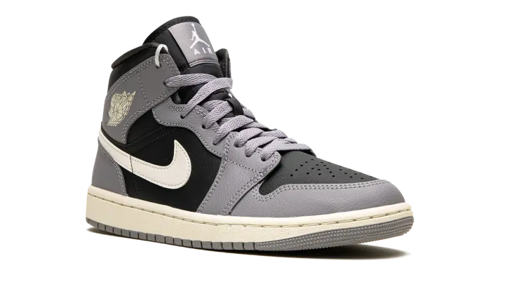 The Women's Air Jordan 1 Mid "Cement Grey" is a women's colorway of the lifestyle shoe with a versatile appearance. The "Cement Grey" is complete with a neutral-based design with black leather appearing on the base and Cement Grey leather appearing on the overlays. A white leather Swoosh on either side of the shoe breaks up the look. Elsewhere, a Sail-colored "Wings" logo is found on the collar and Jumpman and "Air" branding dot the tongue. The cream rubber midsole gives the shoe a vintage look.