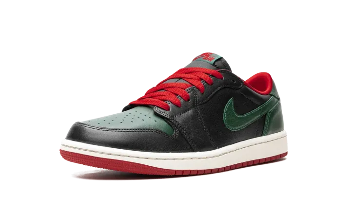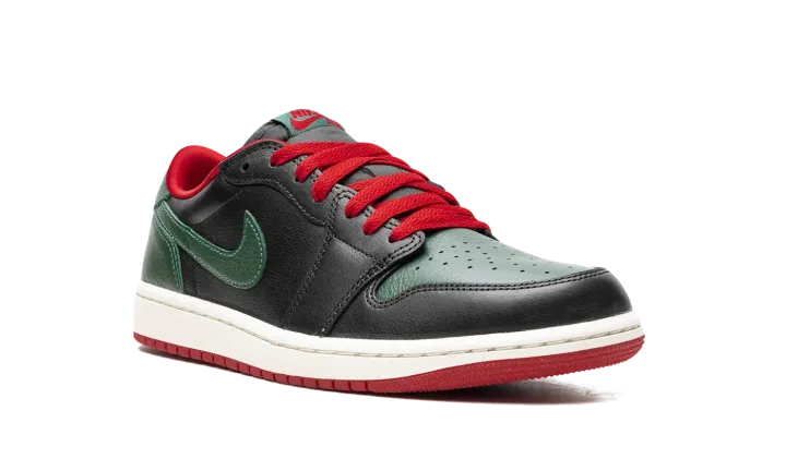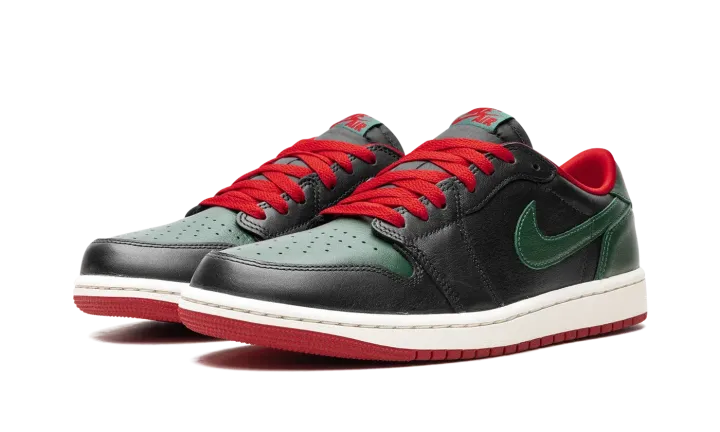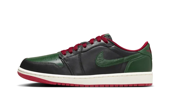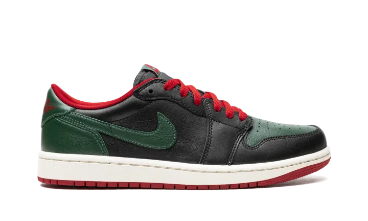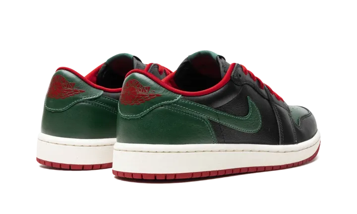 The Women's Air Jordan 1 Low OG "Black/Gorge Green" is a women's-exclusive colorway of the retro basketball shoe with a high-end fashion-inspired vibe. While in no way associated with Gucci, the "Black/Gorge Green" features the same color scheme as the high fashion brand, which gives the shoe a decidedly upscale look. Specifically, the upper features Gorge Green leather on the perforated toe, Swoosh, and heel. Black leather can be found on the toe, forefoot, mid-panel, and eyelets. Varsity Red accents appear on the inner lining, laces, and "Wings" branding on the heel. Release date: June 12, 2024