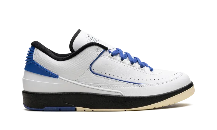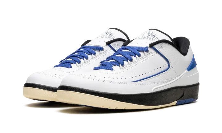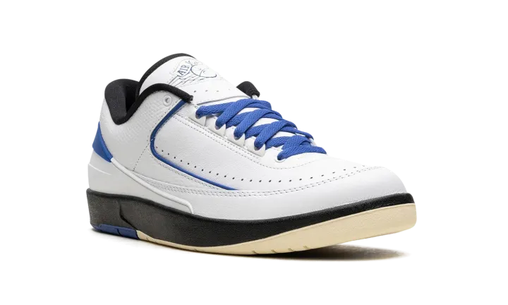 The Women's Air Jordan 2 Low "Varsity Royal" is a women's-exclusive colorway of Michael Jordan's second signature shoe with blue accents. This clean and sporty look for the Jordan 2 Low features a white leather construction with textured leather overlays with Varsity Royal piping. Additional Varsity Royal accenting appears on the heel counter, laces, and rubber outsole. As for the rest of the shoe, a tonal "Wings" logo is seen on the tongue and the black rubber midsole is paired with a split cream and royal blue rubber outsole. Release date: July 6, 2023