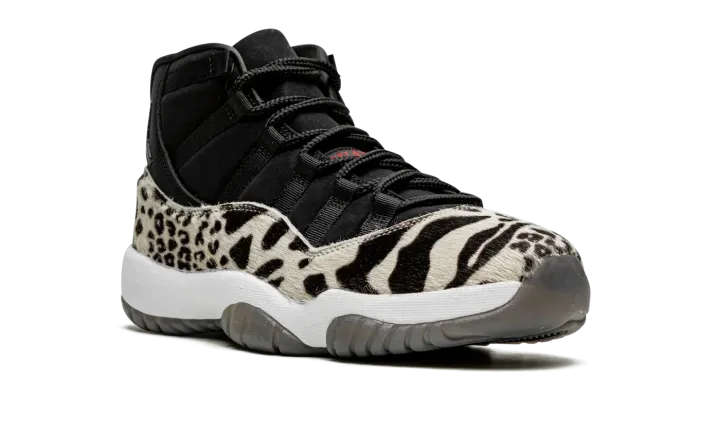 The Women's Air Jordan 11 "Animal Instinct" is a women's-exclusive colorway of the vintage basketball shoe with three different animal-inspired patterns on its luxurious design. A Holiday 2021 release by Jordan Brand, the "Animal Instinct" is one of the boldest colorways of Michael Jordan's eleventh signature shoe ever produced by Jordan Brand. The look, which borrows stealthy, black-based design elements from the shoe's "Cap and Gown" colorway, is complete with a black leather upper with a faux fur mudguard that features a mixture of cheetah, zebra, and leopard prints. A matte black Jumpman appears on the collar and red "23" branding is found on the heel. Classic red-based "Jumpman" detailing graces the black nylon tongue. A white foam midsole and translucent black outsole complete the look. Release date: November 26, 2021