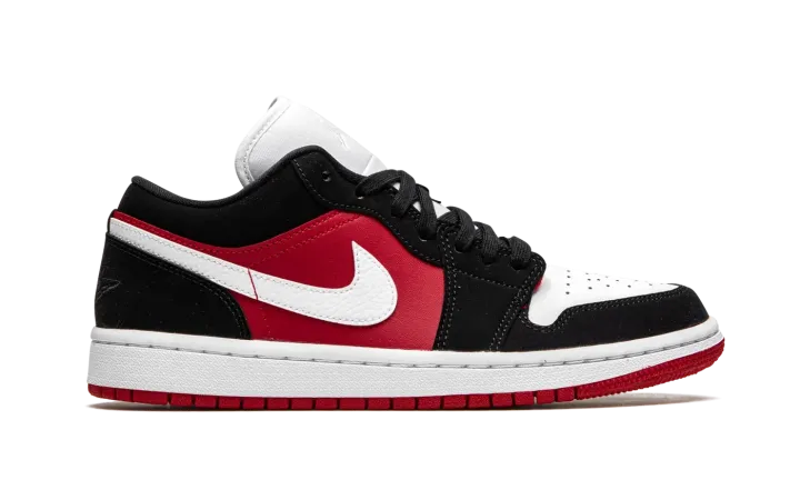 The Women's Air Jordan 1 Low "Black/White/Gym Red" is a women's version of Michael Jordan's iconic signature shoe in its low-top silhouette that draws favorably from the Chicago Bulls team colors. The model makes use of the basketball team's white, black, and red team uniform colors on its design, a look that has been popularized by Air Jordans since the beginning of the signature shoe collection. Supple white tumbled leather appears on the Swoosh detailing on either side. A smooth cut of white leather is located on the perforated toe. The white nylon tongue features a tonal embroidered Jumpman and is contrasted by black shoe laces. The eyelets, forefoot, collar, and heel are finished off in a black synthetic nubuck material. Fiery Gym Red leather can be found on the mid-panel to finish off the look.