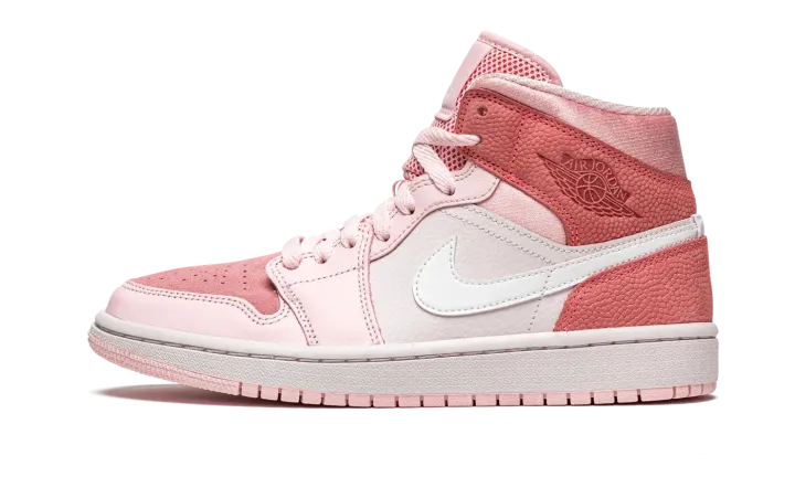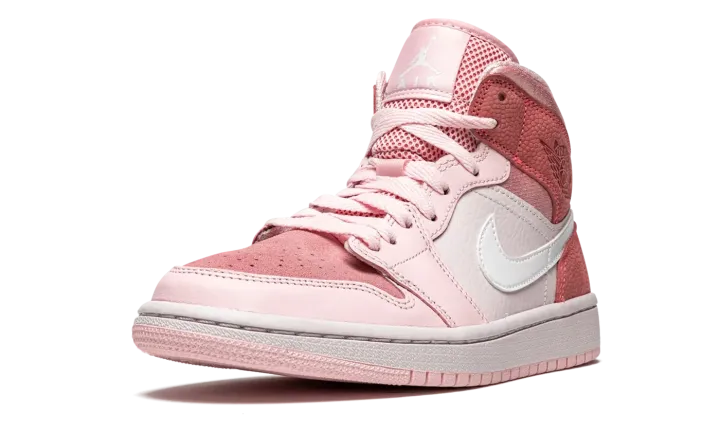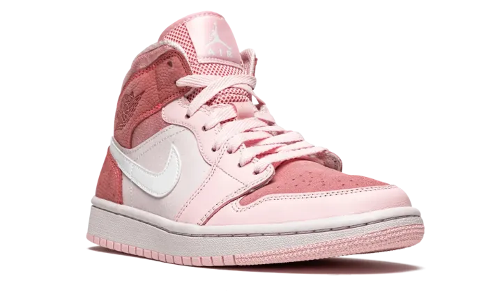 The Air Jordan 1 Mid "Digital Pink" is a springtime-inspired makeup of Michael Jordan's first signature shoe in the popular mid-top silhouette. A Spring 2020 release by Jordan Brand, the "Digital Pink" recruits an interesting combination of soothing shades of pink in materials not commonly found on the Air Jordan 1. Both the perforated suede toe and the basketball-like pebbled leather collar and heel overlays display a Digital Pink construction. A lighter variant of the hue can be found on the laces and on the smooth leather toe cap, forefoot, and eyelets. A white leather Swoosh adorns both sides and a tonal embossed "Wings" logo appears on the collar. The pink tongue tag stitched onto the textured mesh tongue features white Jumpman and "Air" insignia. A cream-colored rubber midsole and Digital Pink outsole complete the look.