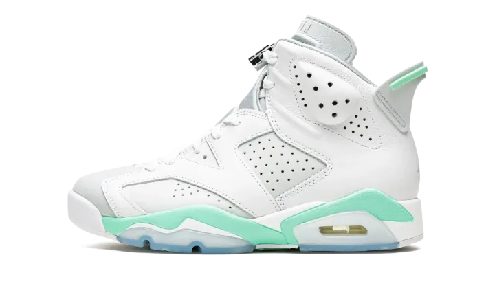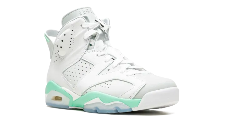 The Women's Air Jordan 6 "Mint Foam" is a women's-exclusive colorway of Michael Jordan's retro basketball shoe in a versatile color block with appealing mint accenting. A standout release from Jordan Brand's Spring 2022 collection, the "Mint Foam" edition of the Jordan 6 features a Pure Platinum synthetic nubuck base with contrasting white leather panels on the upper. Mint Foam detailing comes into play on the Jumpman logo embroidered on the tongue, on the lace toggle, and painted midsole. Additional mint accenting can be found on the spoiler and Jumpman on the heel. A clear Air unit in the midsole completes the look. Release date: March 8, 2022