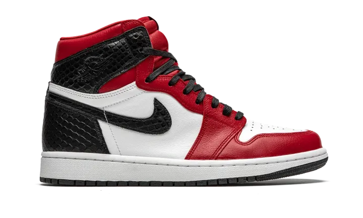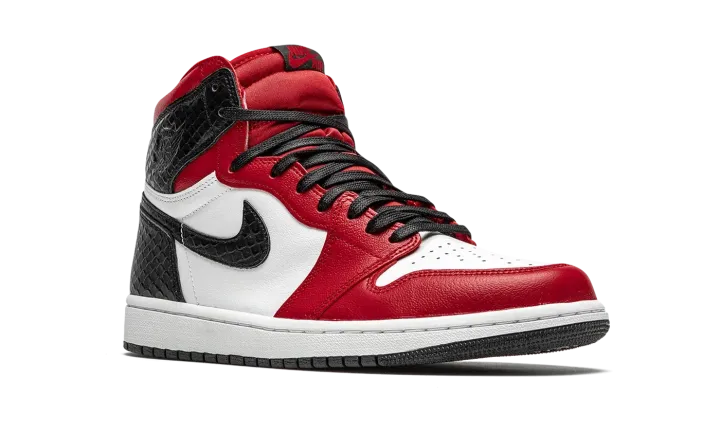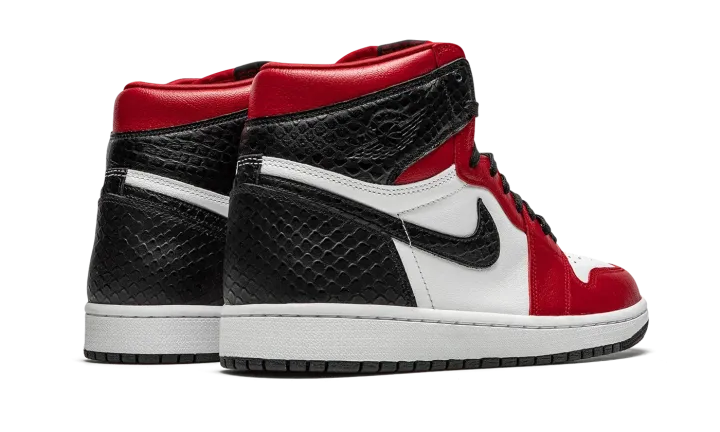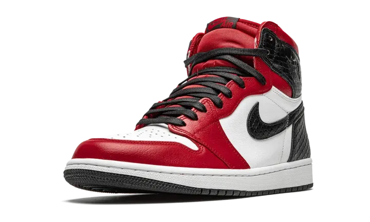 The Women's Air Jordan 1 High "Satin Snake" is an eccentric colorway in women's sizing of Michael Jordan's popular signature shoe. Jordan Brand's reimagining of the classic "Chicago" design in lifestyle materials such as satin and faux snakeskin continues on this luxurious "Satin Snake" makeup. Keeping the color block close to the original "Chicago" colorway, the upper features a white leather mid-panel and perforated toe. Contrasting red leather overlays dot the forefoot, eyelets, and collar. A black snakeskin leather covers the Swoosh, ankle collar, and heel. Red satin is utilized for the tongue and inner lining, while waxed black cotton laces finish the look of this opulent Jordan 1 in women's sizing. Release date: August 6, 2020.