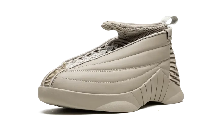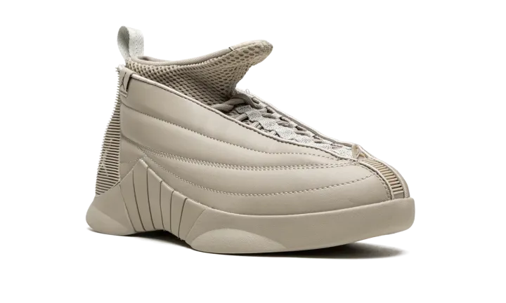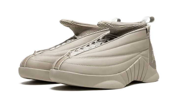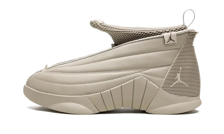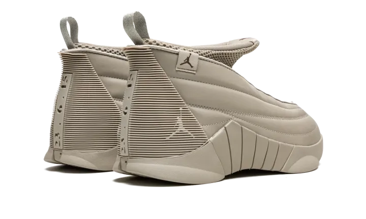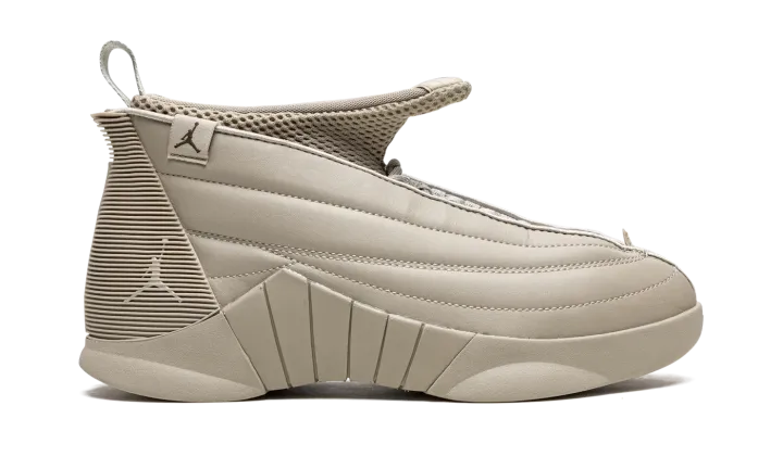 The Billie Eilish x Air Jordan 15 is a limited edition collaboration between the Grammy Award-winning singer and Jordan Brand on Michael Jordan's fifteenth signature shoe. Releasing around the same time as Eilish's collaborative neon green Air Jordan 1 KO in September 2021, the Jordan 15 is produced from at least one-fifth recycled materials. The entire shoe appears in a monochromatic beige colorway for a futuristic vibe. A tonal Jumpman is found on the lateral side of the heel and a small black Jumpman is located on the beige nylon tag on the collar. The Jordan 15's bootie-like mesh collar appears in the same beige hue as the rest of the shoe. Release date: September 30, 2021
