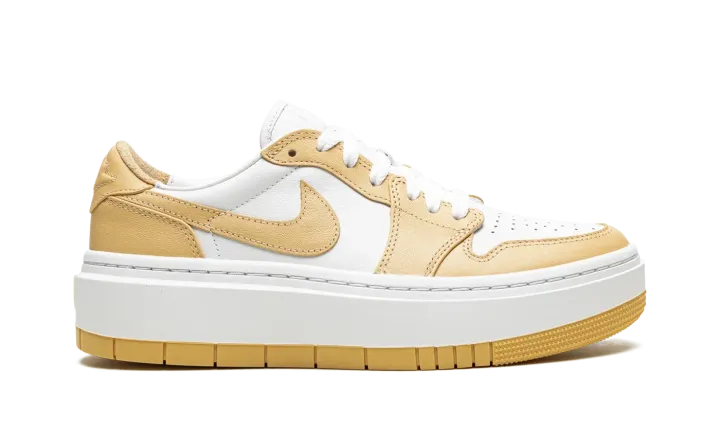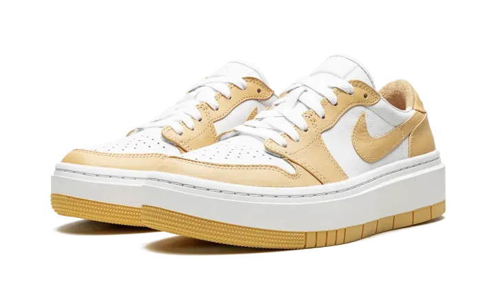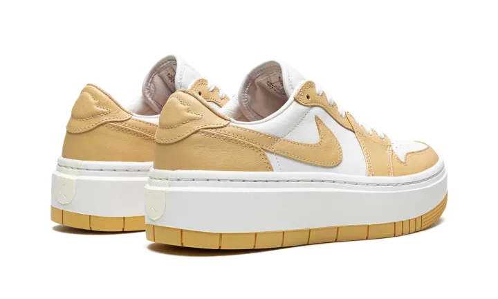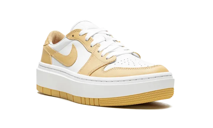 The Women's Air Jordan 1 Elevate Low "White/Tan is an updated style of the Air Jordan 1 featuring a chunky platform sole and a simple two-toned colorway. This platform Air Jordan 1 is constructed with a white leather base that extends to the tongue and liner. Light tan leather overlays cover the white panels, including the Swooshes. Finishing details include a white midsole, tan rubber outsole, the Jordan wings logo on the heels, white laces and cork insoles.