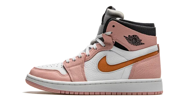 The Women's Air Jordan High Zoom CMFT "Pink Glaze" is a premium lifestyle colorway of Michael Jordan's first signature shoe fitted in women's sizing. The Jordan 1 High Zoom CMFT is a popular look based on the original Jordan 1 silhouette with a few modifications. A performance-leaning Zoom Air cushioned midsole is lifted from Nike Basketball's catalog. Buttery Pink Glaze tumbled leather overlays can be found on the forefoot, eyelets, collar, and heel. Jordan Brand adds white leather to the perforated toe and to the mid-panel to contrast the look. A cut-out Swoosh appears on either side of the shoe and a black "Wings" graphic is located on the collar. The mesh tongue displays a "Zoom Air" branding tag in reference to the upgraded cushioning underfoot. Exposed foam padding peers out from the front of the collar, giving the Women's Air Jordan 1 High Zoom CMFT "Pink Glaze" an intentionally unfinished look.