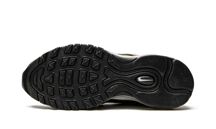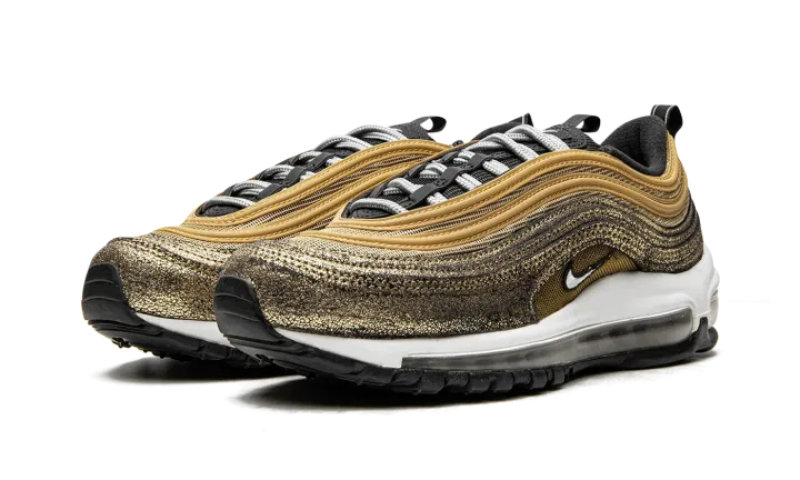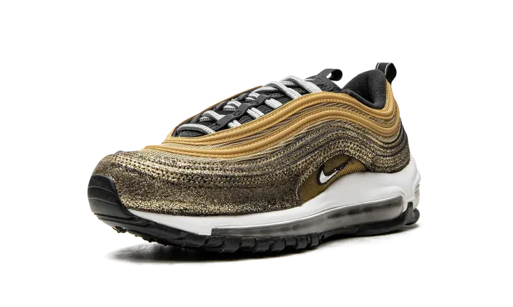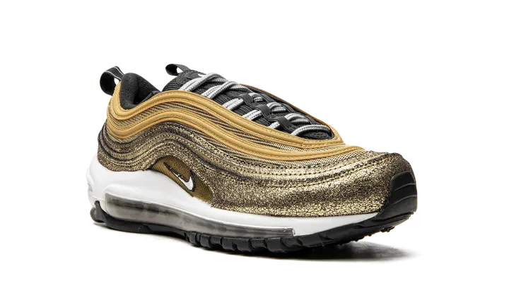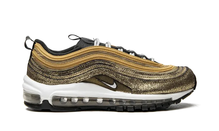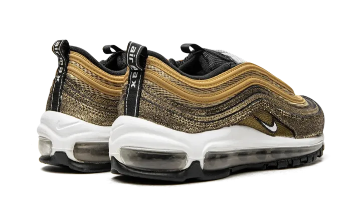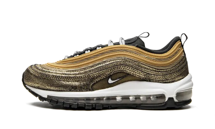The Women's Nike Air Max 97 "Golden Gals" nods to the golden glitz and glam of today's creative makeup trends. This gleaming sneaker features gold flake overlays and gold reflective material to create a shiny, luxe appearance. Black accents are found throughout the sneaker, while a white midsole and the Air Max 97's signature full-length Air Max tooling finish off the design