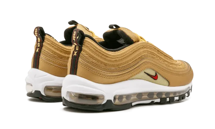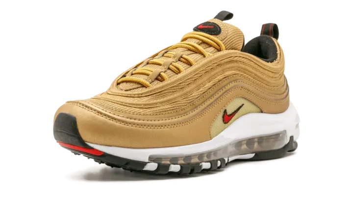 The women's Nike Air Max 97 "Metallic Gold" brings the iconic golden colorway of the silhouette in sizing specifically for the ladies. An original colorway for the shoe that debuted Nike's full-length Air unit, this women's Air Max 97 "Metallic Gold" features golden mesh and synthetic leather paneling across the upper, a white midsole, and hits of red for the branding. The Air Max 97 "Metallic Gold" is ready to shine with its timeless look and all-day comfort.